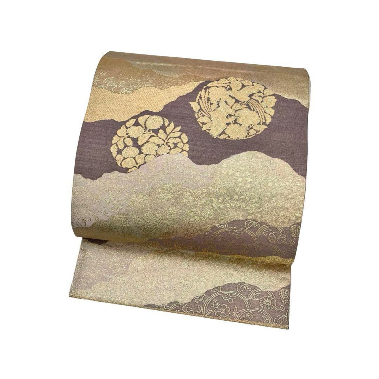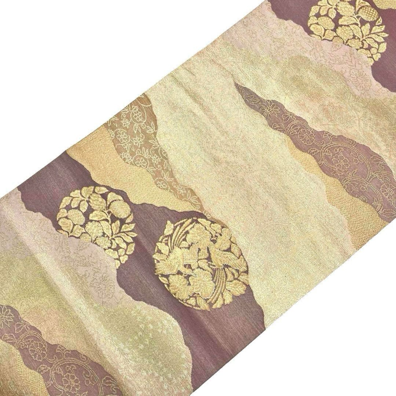 袋帯 丸に鳳凰と花唐草模様 道長取り 金糸 薄葡萄紫色 O-3871
