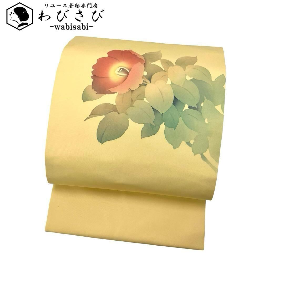 名古屋帯 作家物 塩瀬 花柄模様 卵色 O-3876 着物 きもの kimono 和服 和装 中古 リサイクル着物 【送料無料】