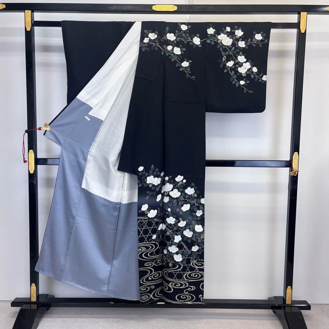 黒色のお色味に金彩が使われた椿の花、観世水模様がデザインされた雰囲気の良い素敵な柄裄のお品でございます。