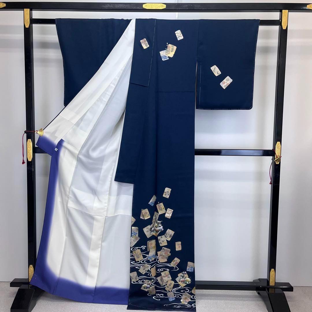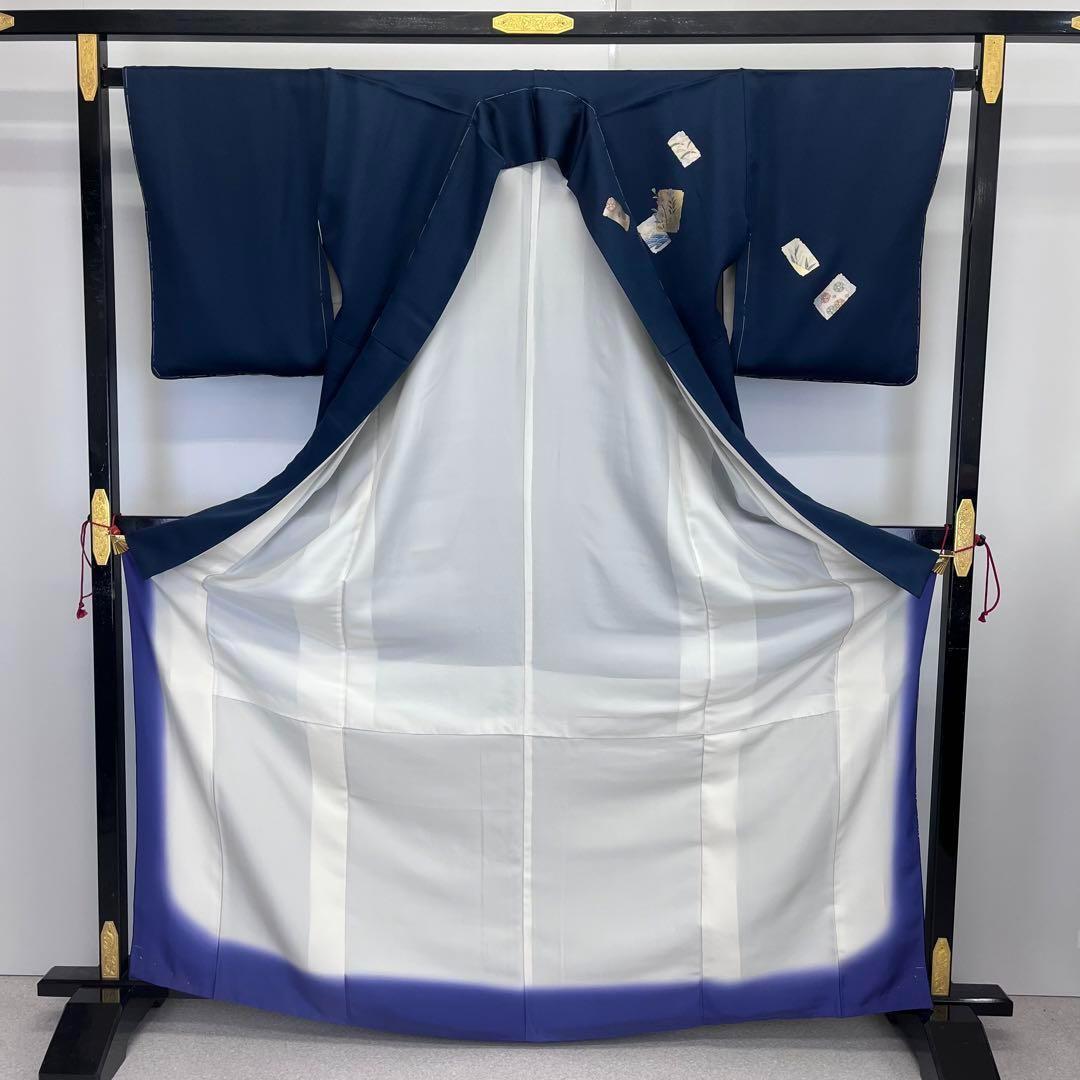 付下げ 四角の中に花模様 流水 椿 菊 萩 金駒刺繍 濃紺色 K-3851 着物 きもの kimono 和服 和装 中古 リサイクル着物 【送料無料】