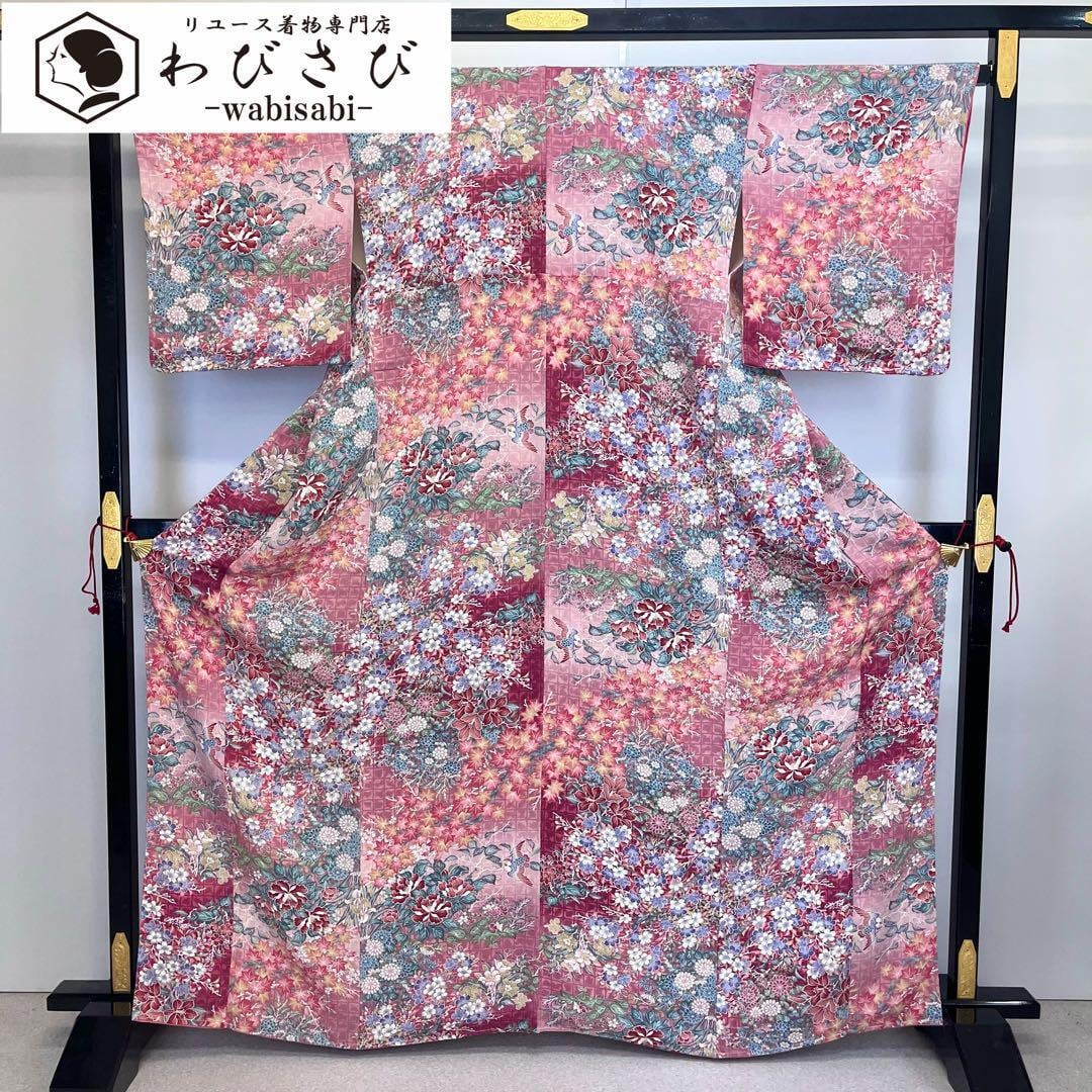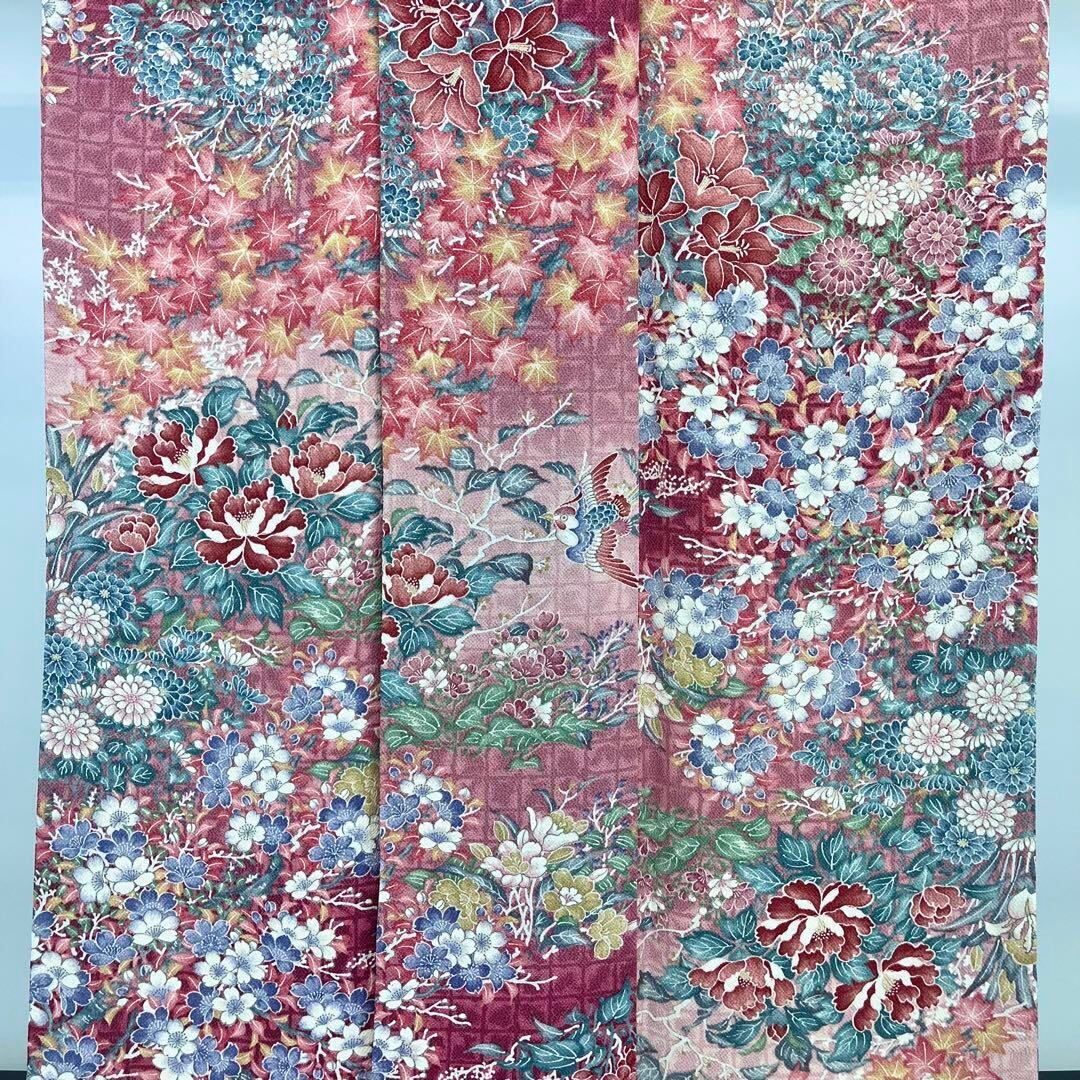 紅鶸色ベースの縮緬に暈し染、四季の鮮やかな花模様に鳥柄の美しいデザインが素敵なお品でございます。