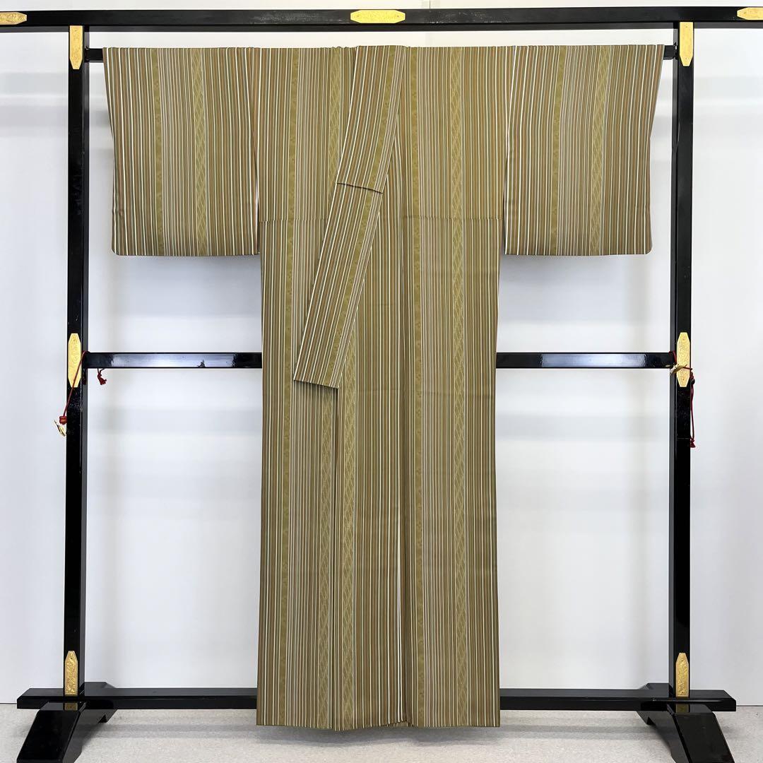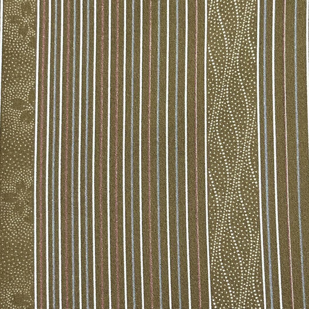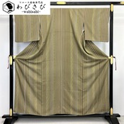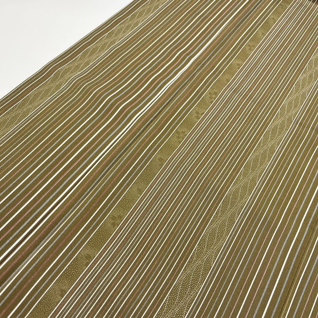 桑色ベースの縮緬に縦柄のストライプ柄、よれ縞、桜の花模様などがデザインされた落ち着きのある素敵な柄裄のお品でございます。