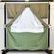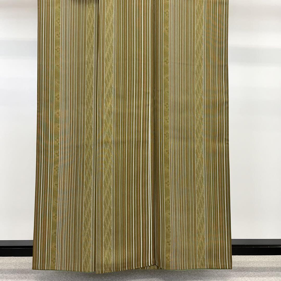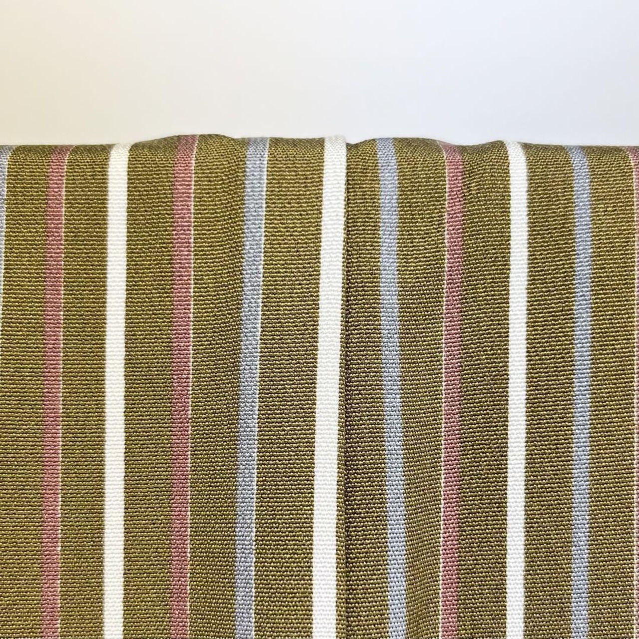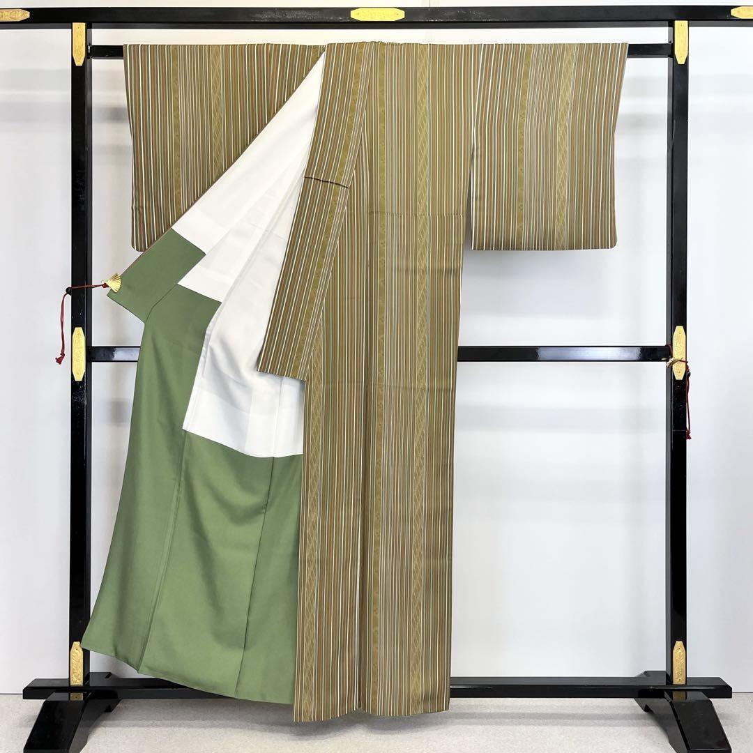桑色ベースの縮緬に縦柄のストライプ柄、よれ縞、桜の花模様などがデザインされた落ち着きのある素敵な柄裄のお品でございます。