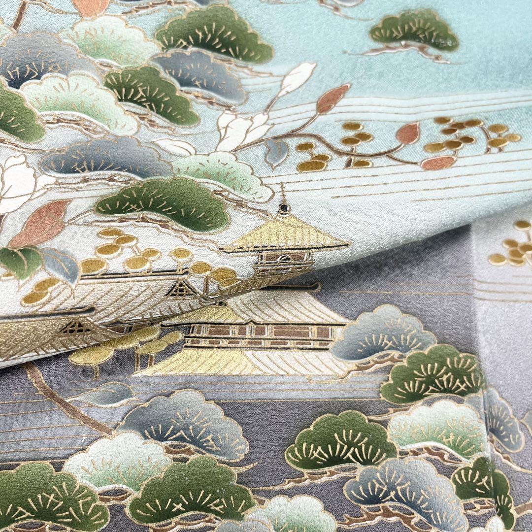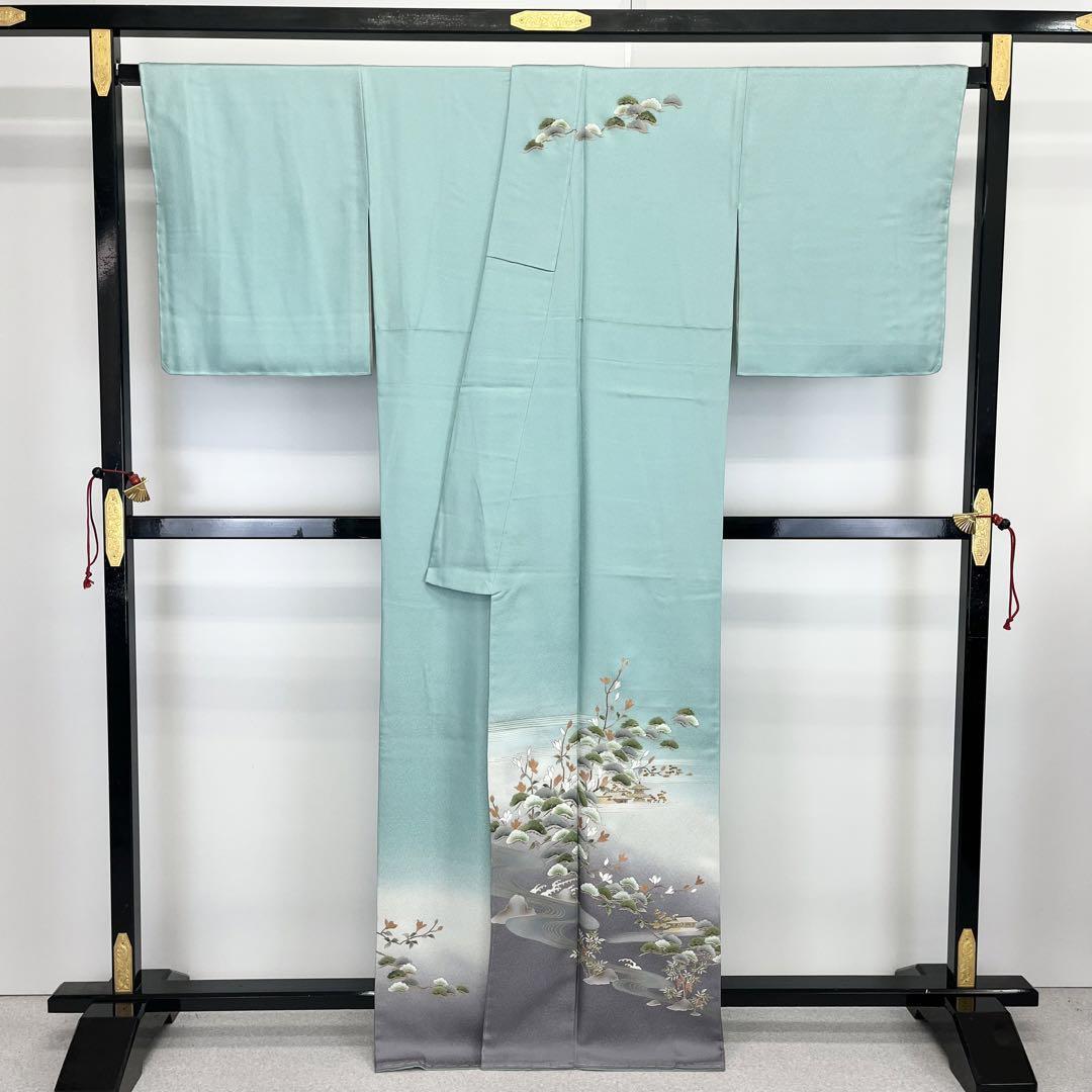 訪問着 流水に松花模様 暈し染 花緑青色 金彩 しつけ糸 K-3839