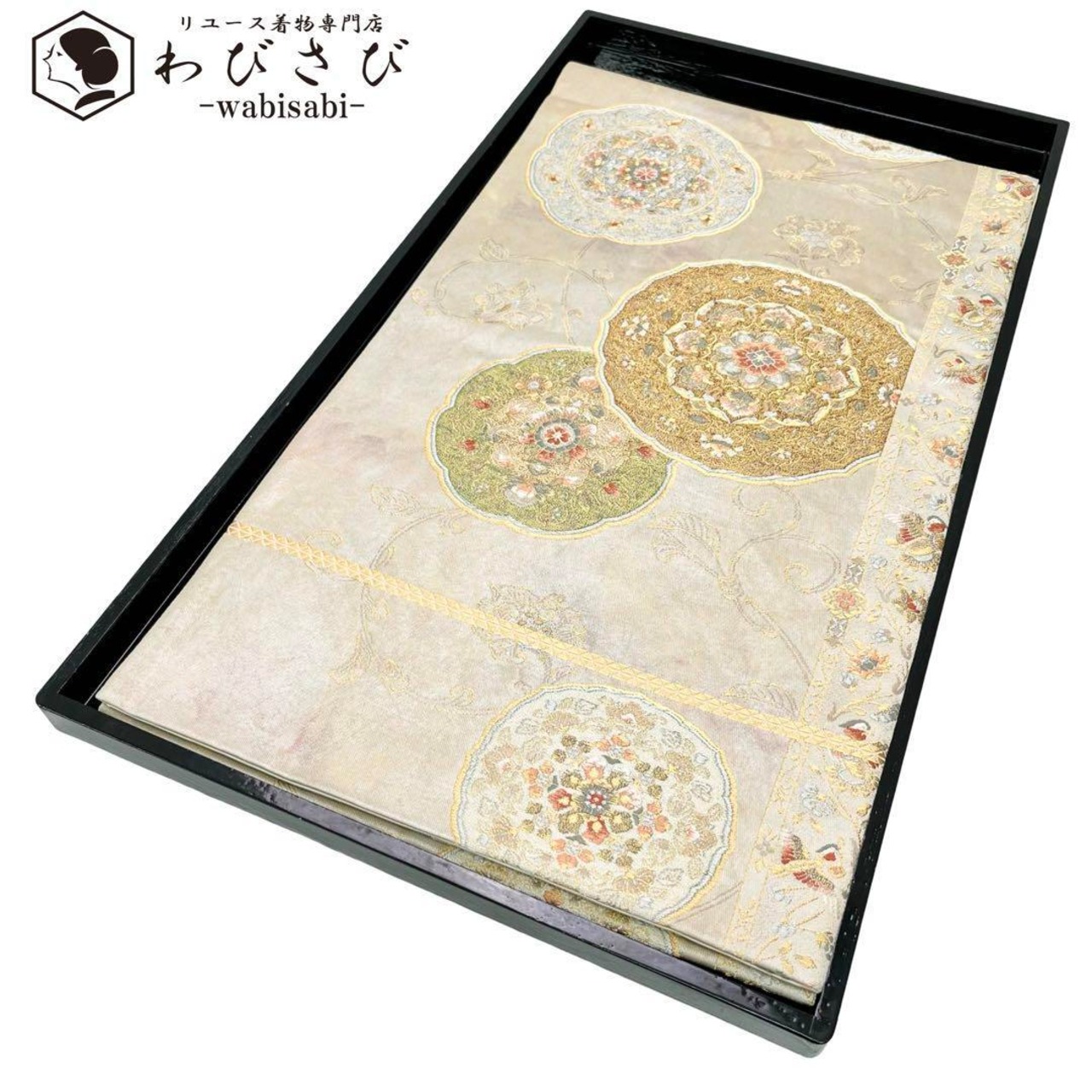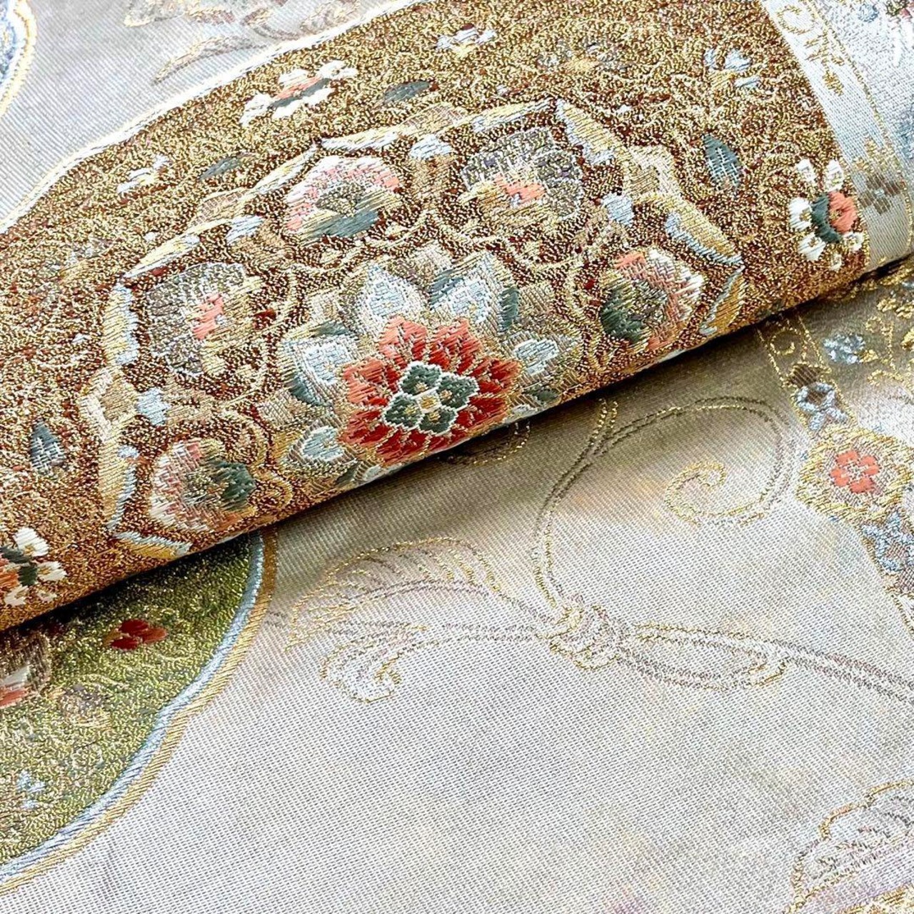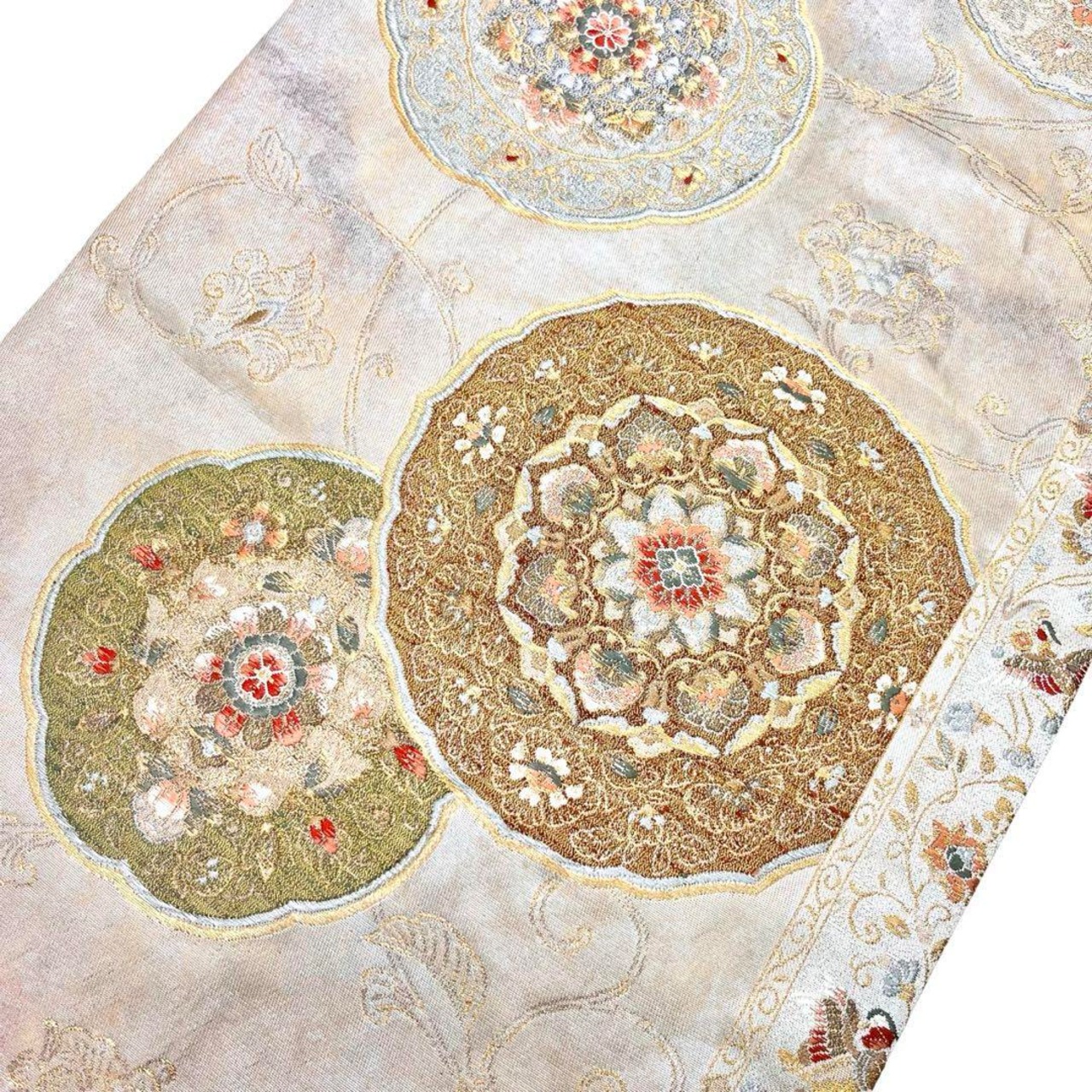 袋帯 紅牙撥鏤尺 美しい華柄模様 金銀糸 練色 O-3884