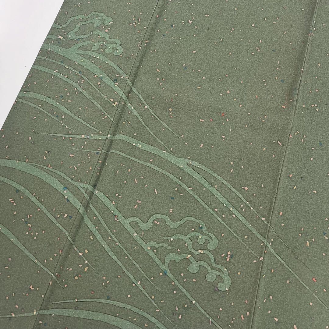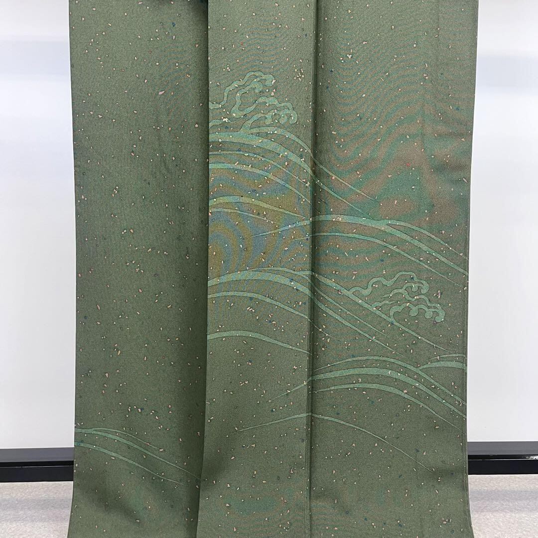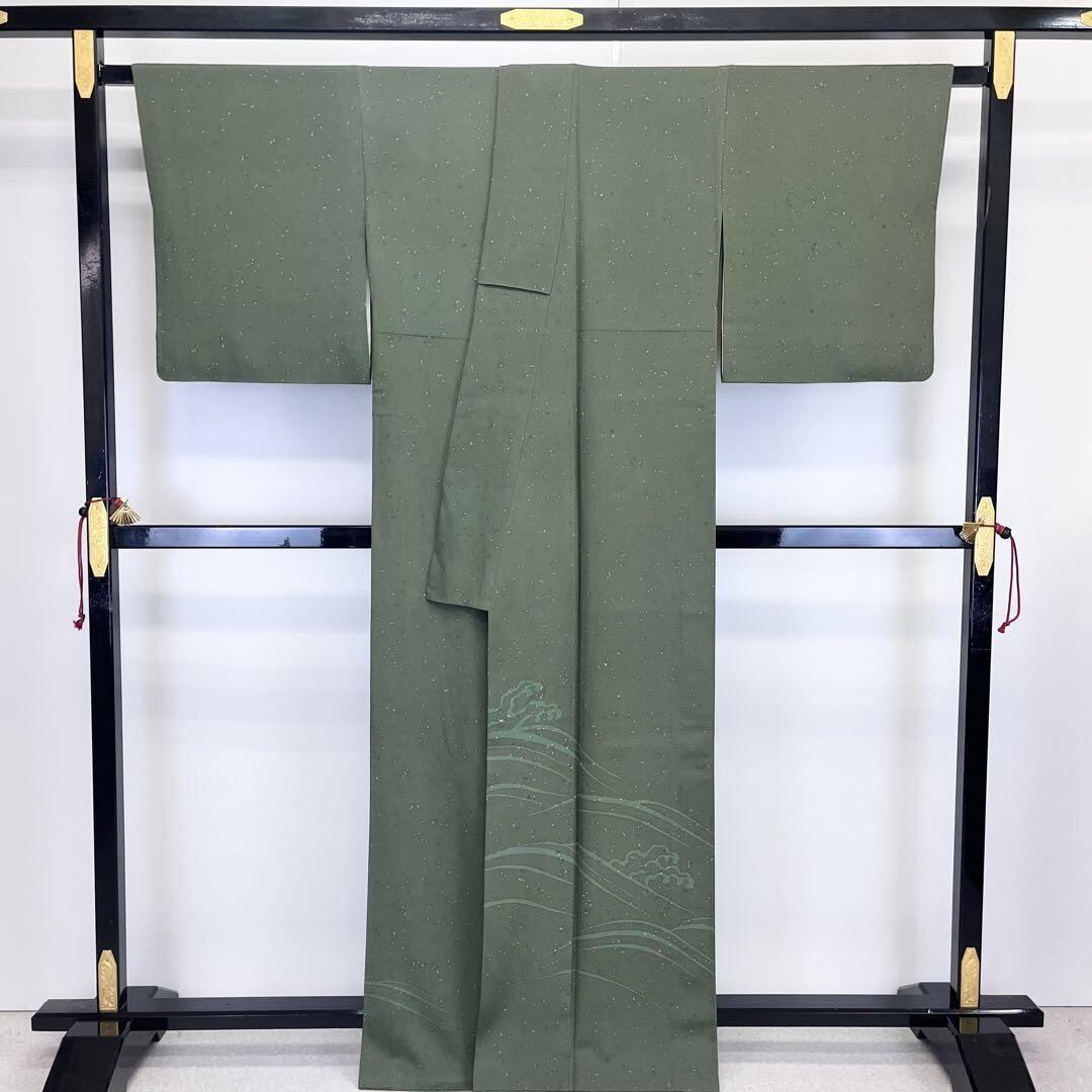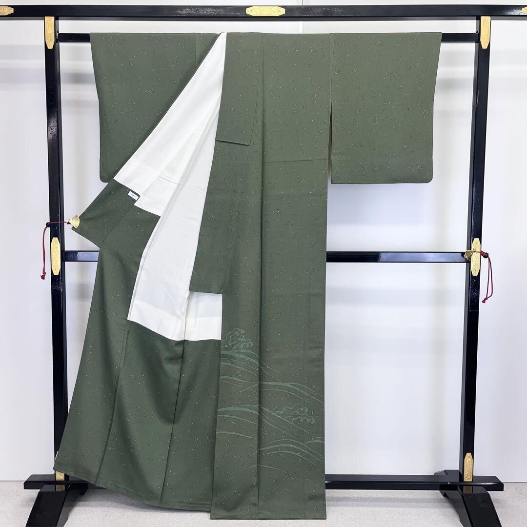 岩井茶色の緑味のお色、手描きの波模様、八掛に飛翔鶴の柄裄がデザインされた落ち着きのある素敵な柄裄のお品でございます。