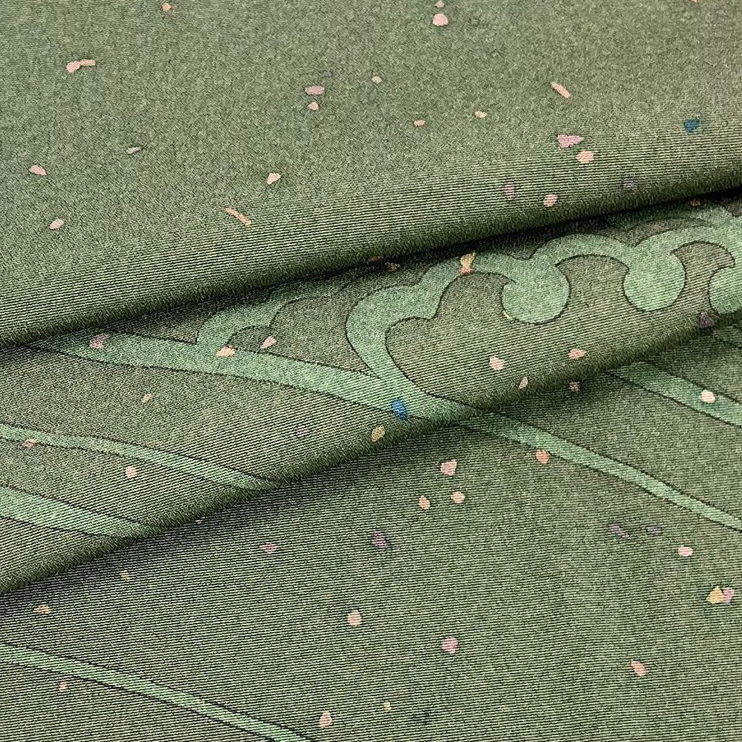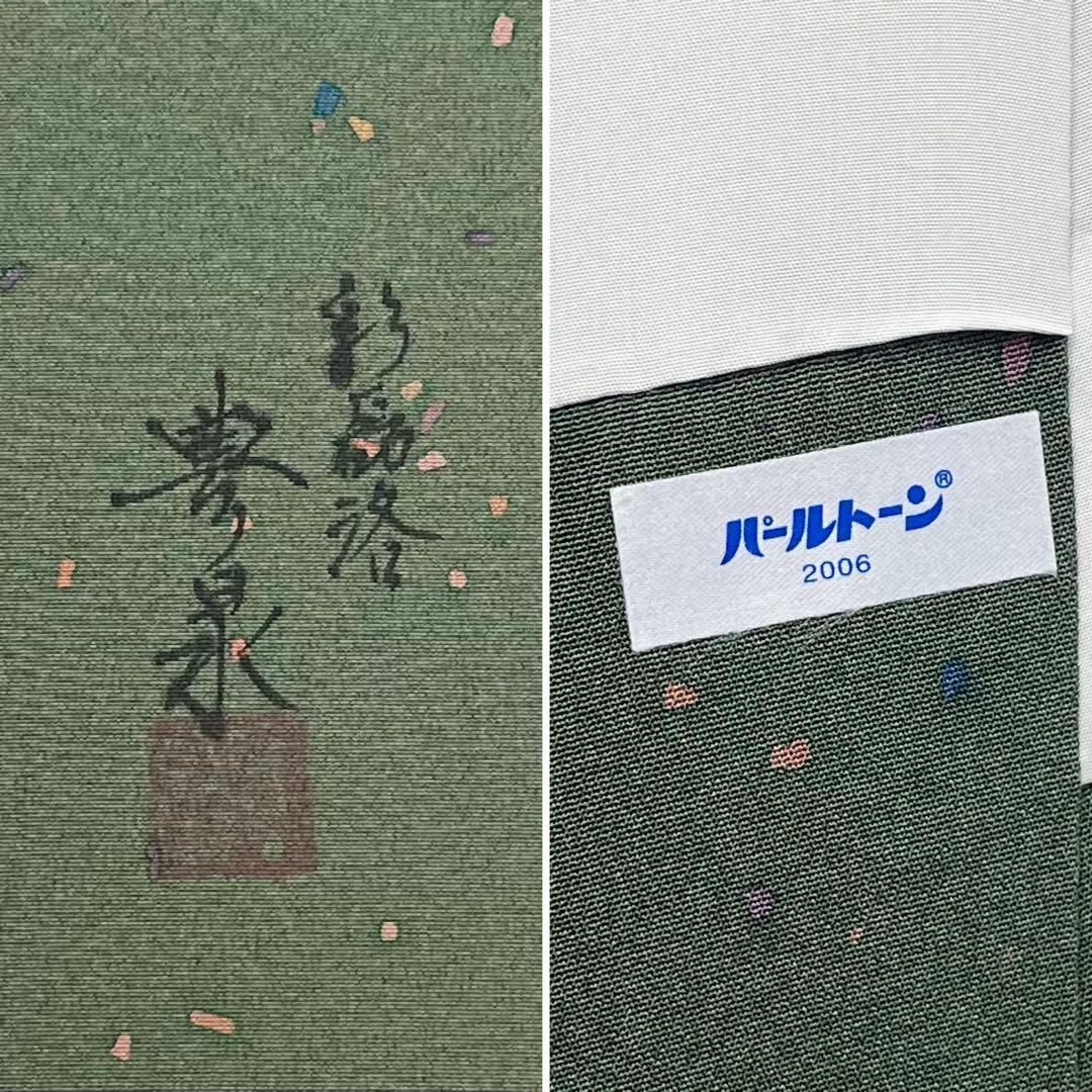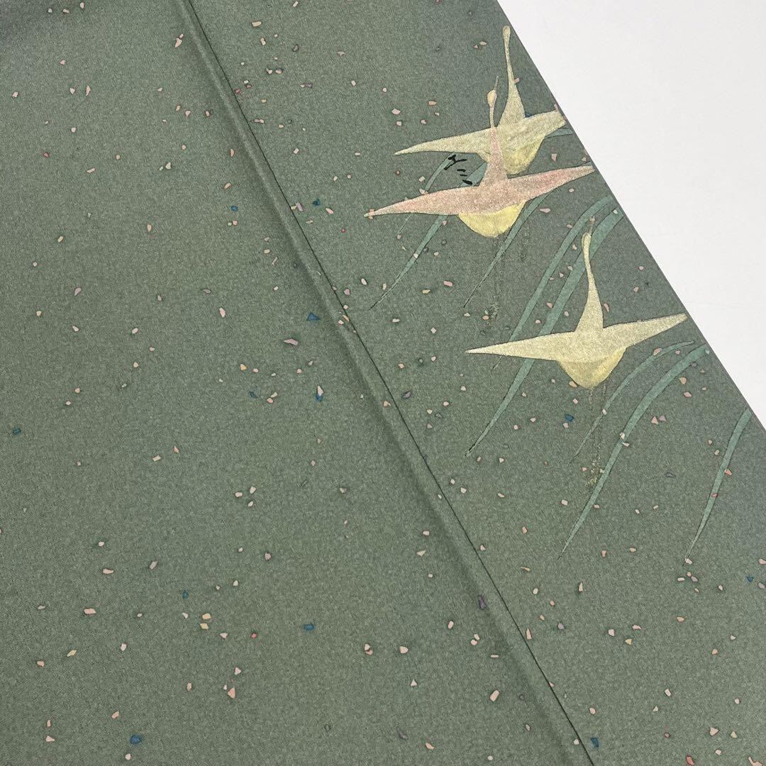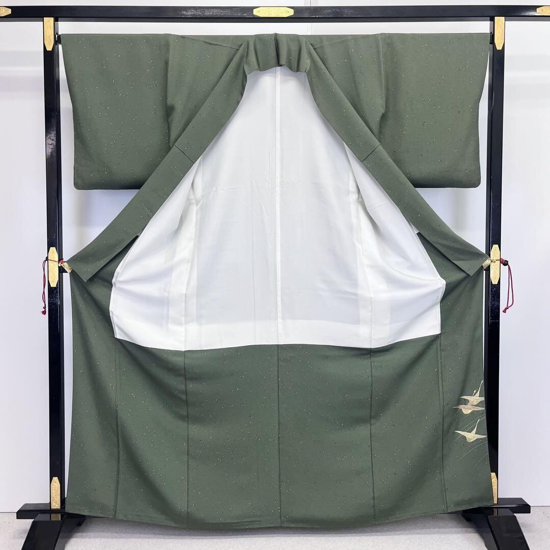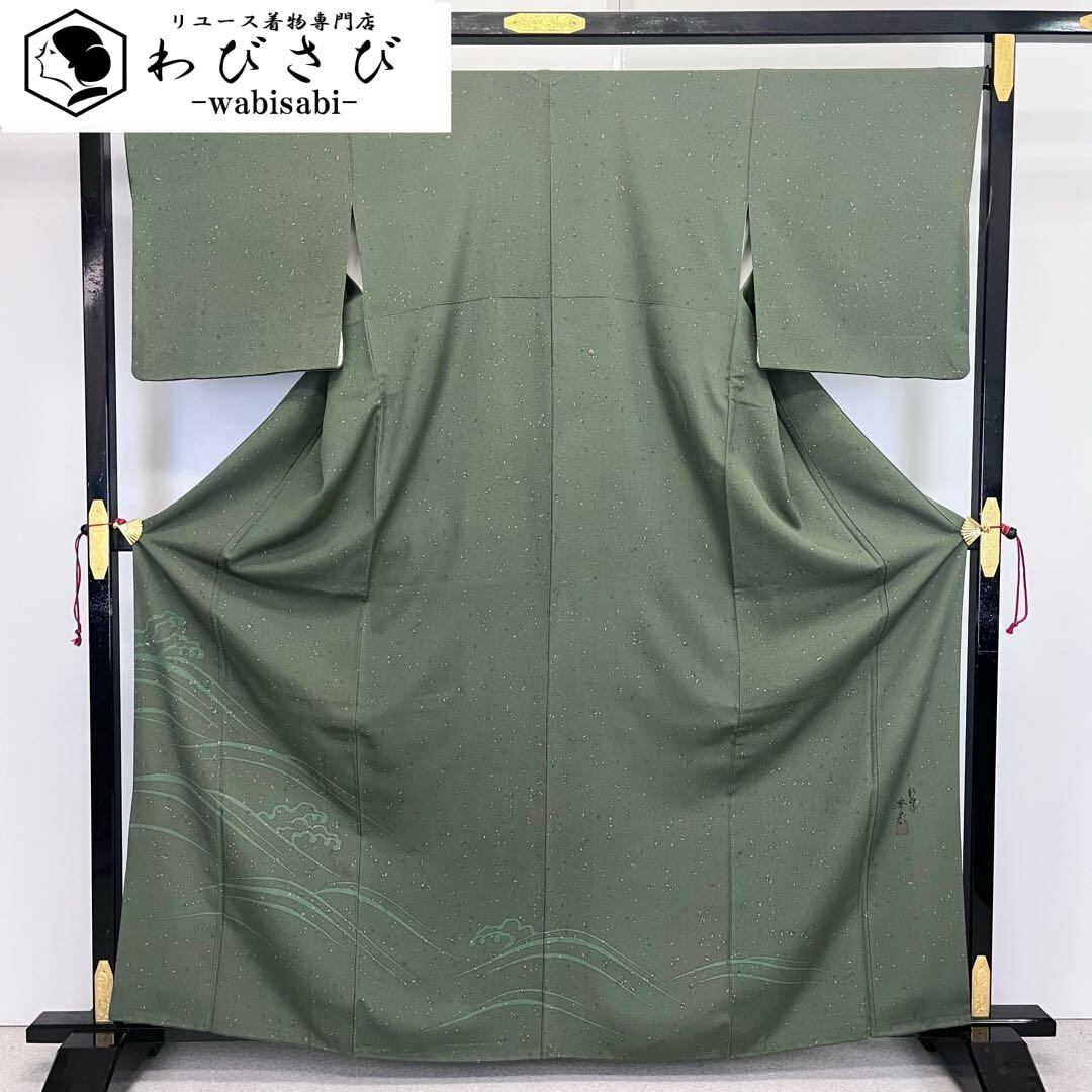 岩井茶色の緑味のお色、手描きの波模様、八掛に飛翔鶴の柄裄がデザインされた落ち着きのある素敵な柄裄のお品でございます。