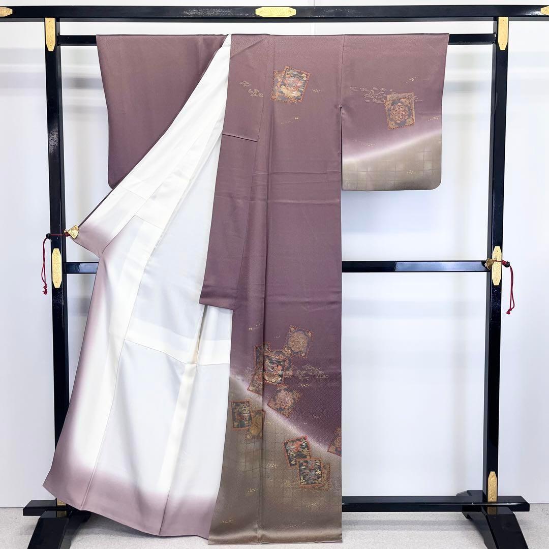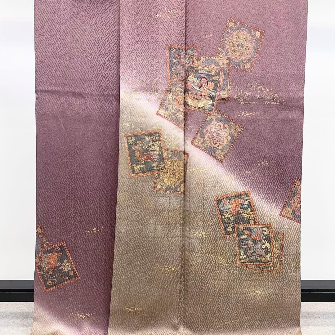 暗紫色に暈し染、格子柄に紗綾形の地模様、金彩が使われた四角の中に華柄模様、鳥、鹿などがデザインされた素敵なお品でございます。