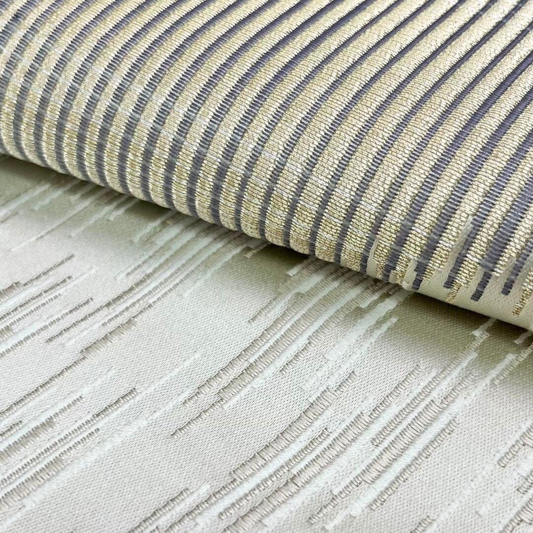 白練色ベースの品のあるお色味に金銀糸が使われた縦線でデザインされたモダンな菱柄模様が素敵なお品でございます。