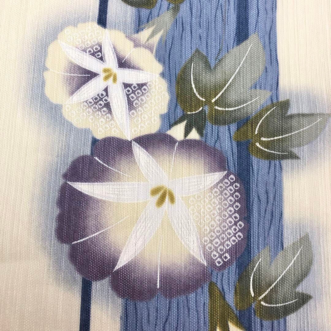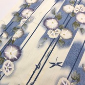 乳白色ベースの上品なお色味、縦縞模様に朝顔と蜻蛉柄がデザインされた素敵な柄裄のお品でございます。