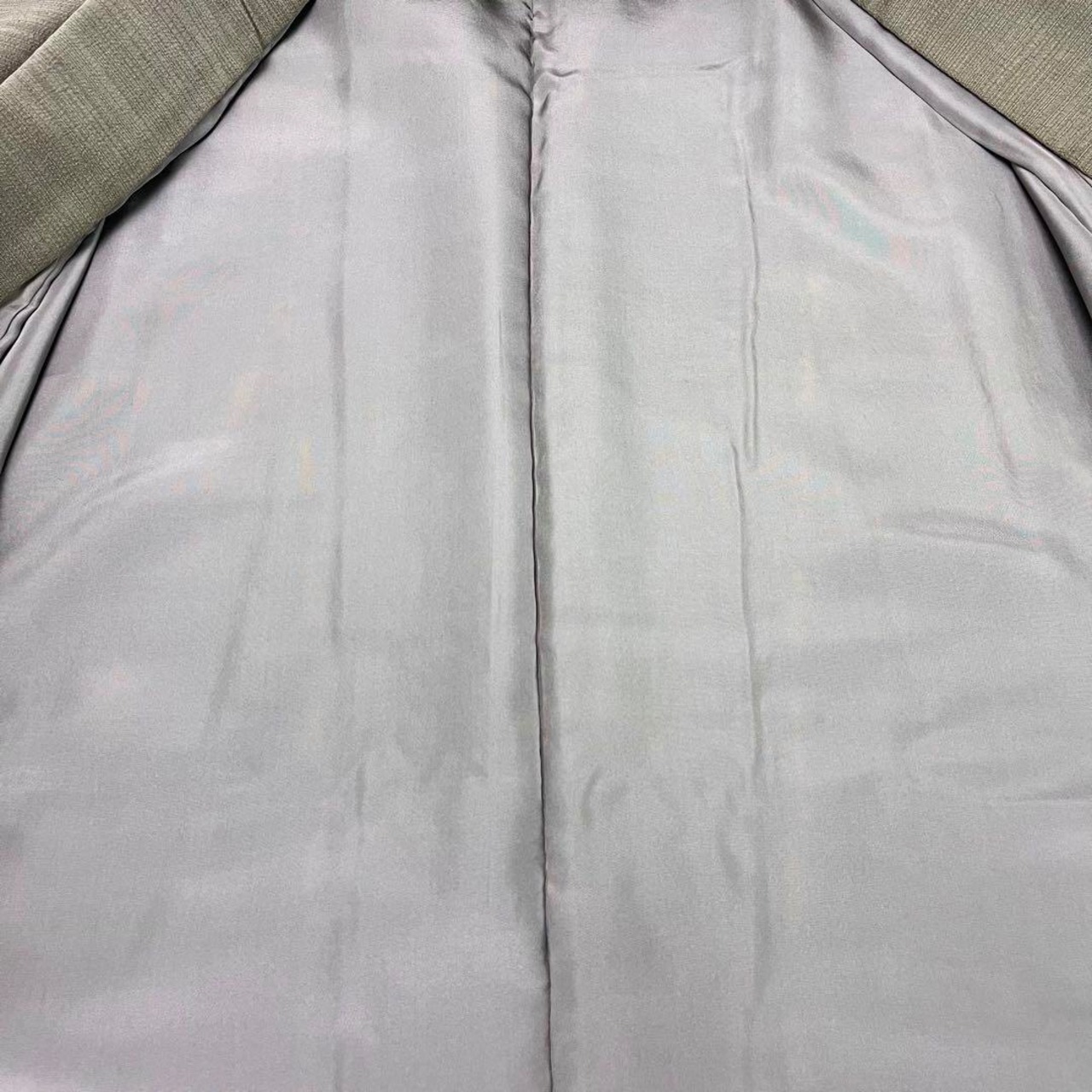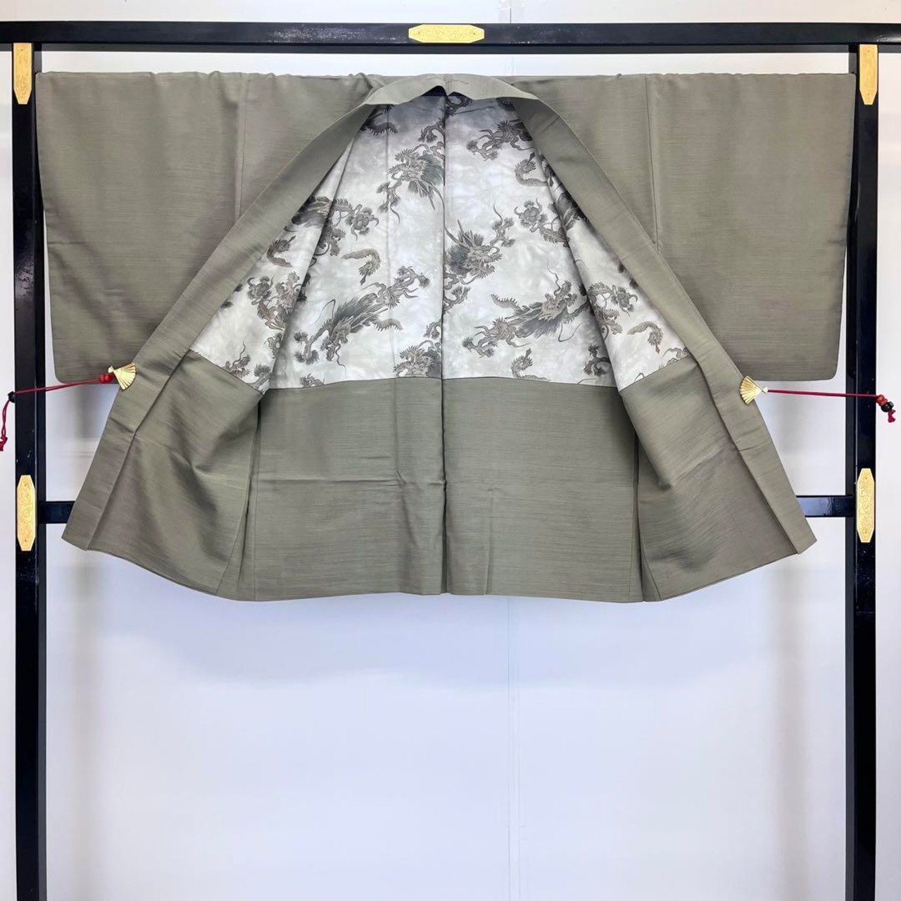 柳鼠色の品のあるお色味の紬、羽裏には龍の柄裄がデザインされた素敵なお品でございます。