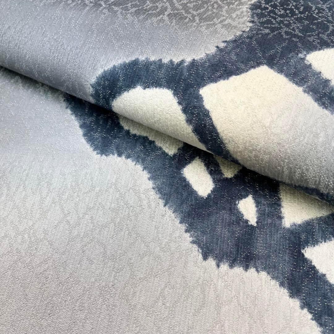 銀通しの薄鼠色のお色味に暈し染、抽象模様がデザインされた雰囲気の良い素敵な柄裄のお品でございます。