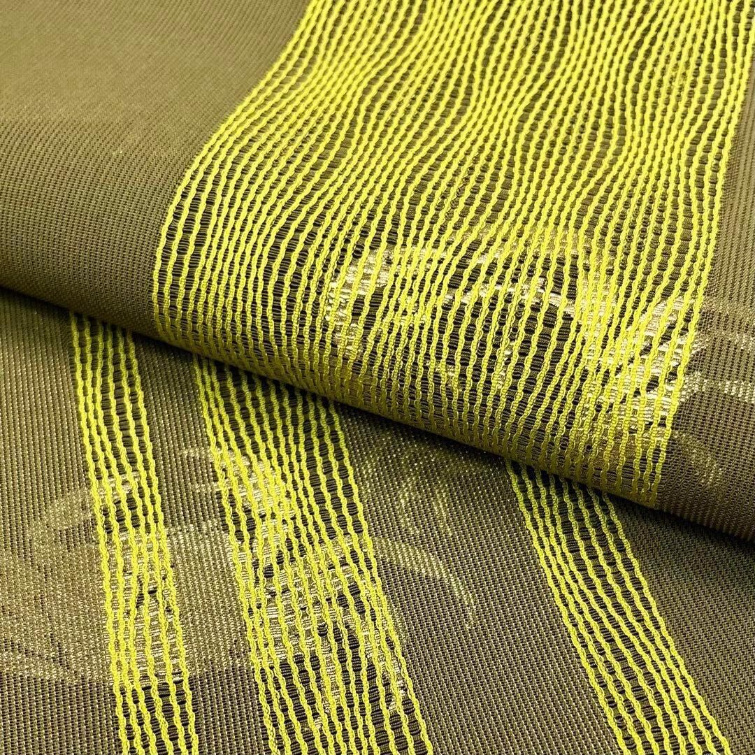 千歳茶色ベースのお色味に金通し、縦柄よれ縞織模様の紗の夏帯生地から透けて見える蟹柄がデザインされた紬地、紗合せのような二重に重なった珍しい仕立ての素敵なお品でございます。