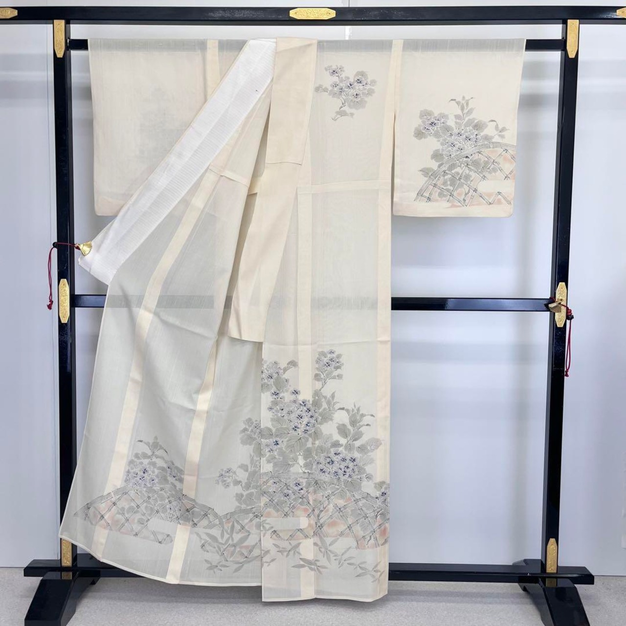 夏着物 紗紬 付下げ 竹垣に紫陽花 薄卵色 K-3895