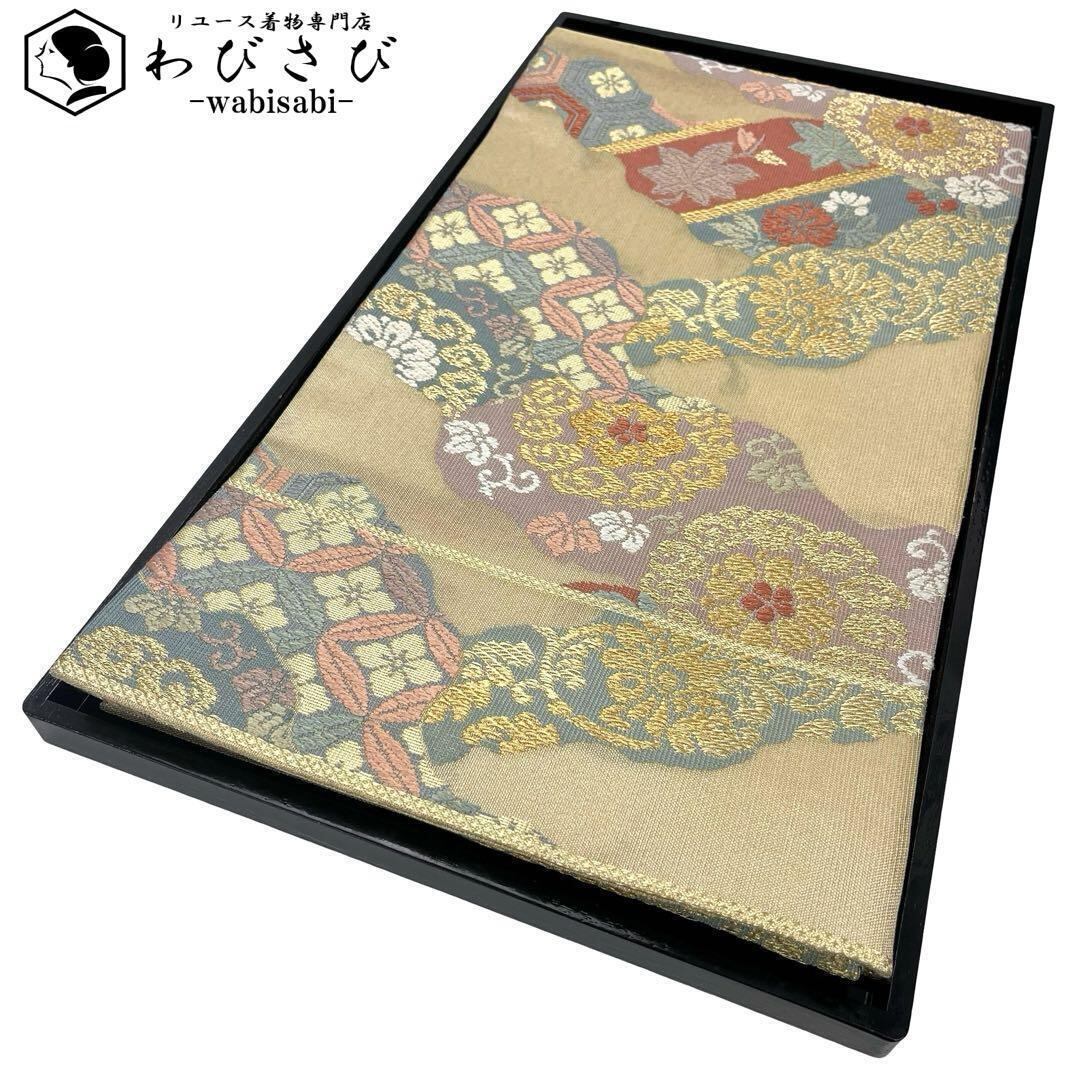 金色ベースのお色味、霞に花模様、花七宝などの柄行がデザインされた素敵なお品でございます。