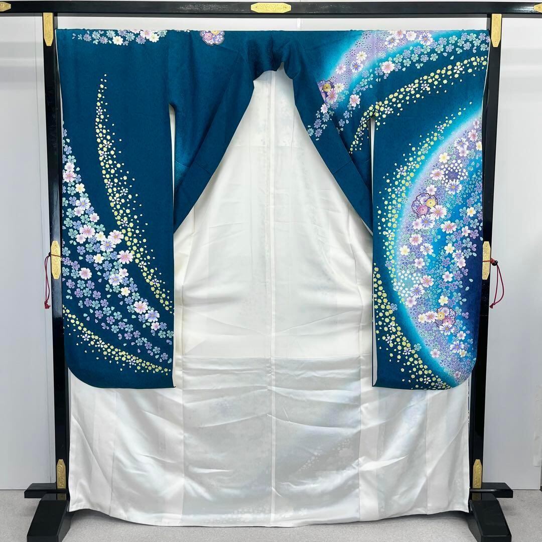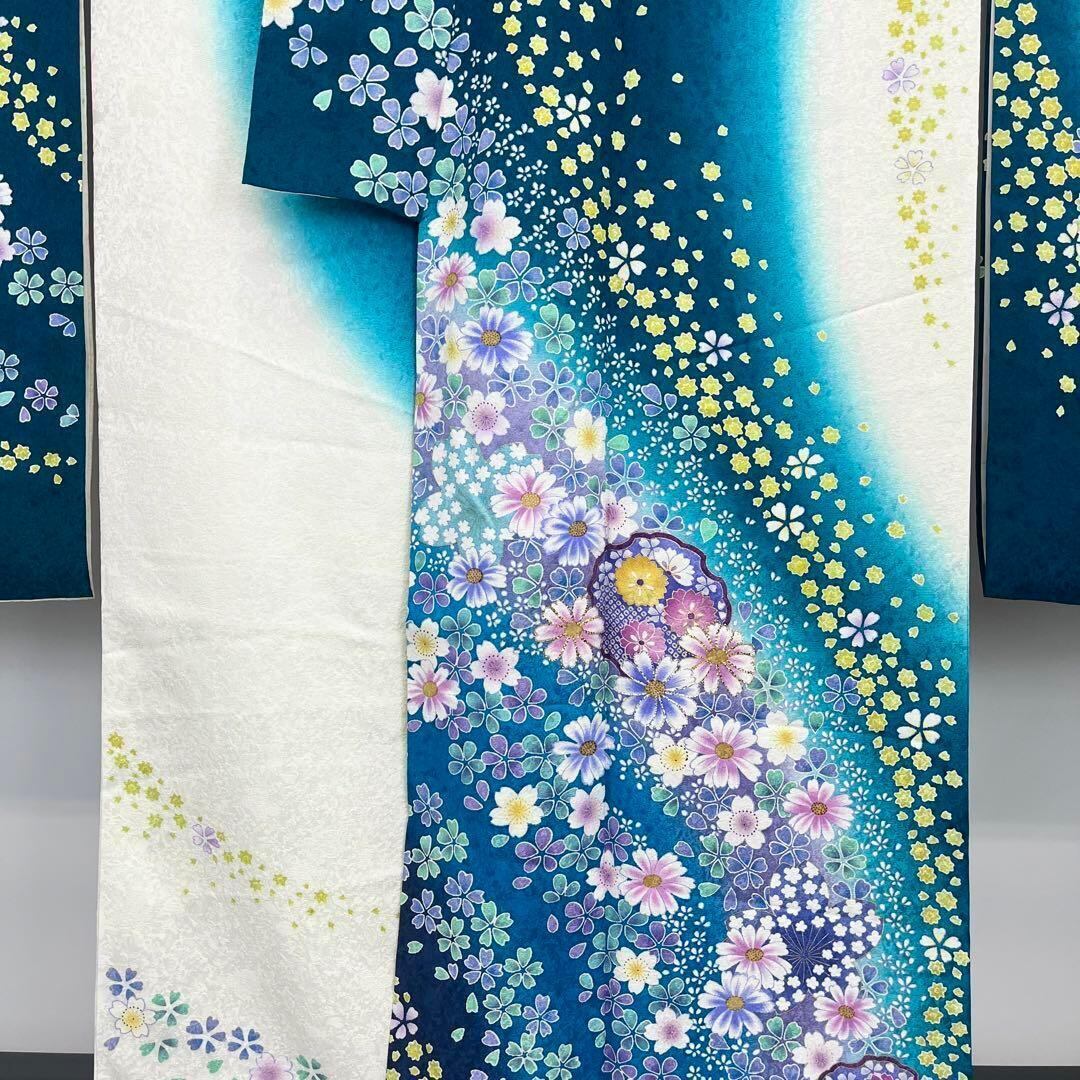 白に青緑色ベースの美しいグラデーションに流れるような彩り鮮やかな花模様がデザインされた華やかな雰囲気の素敵な柄裄のお品でございます。