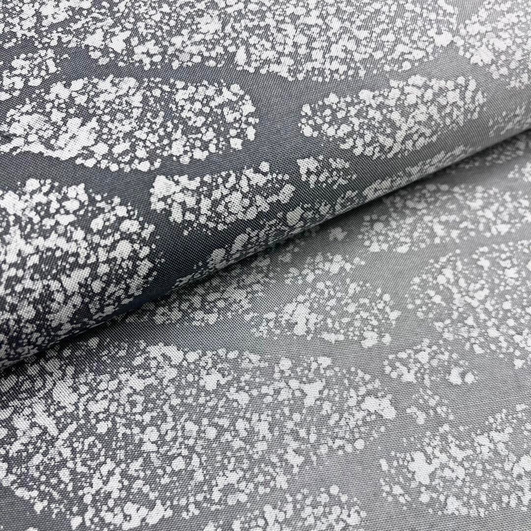灰色ベースのモノトーン調のお色味、ろうけつ染の雰囲気の良い柄裄とグラデーション、両面楽しめる素敵なお品でございます。