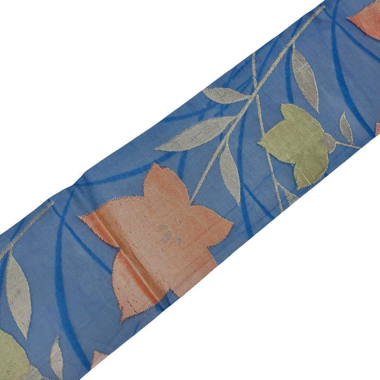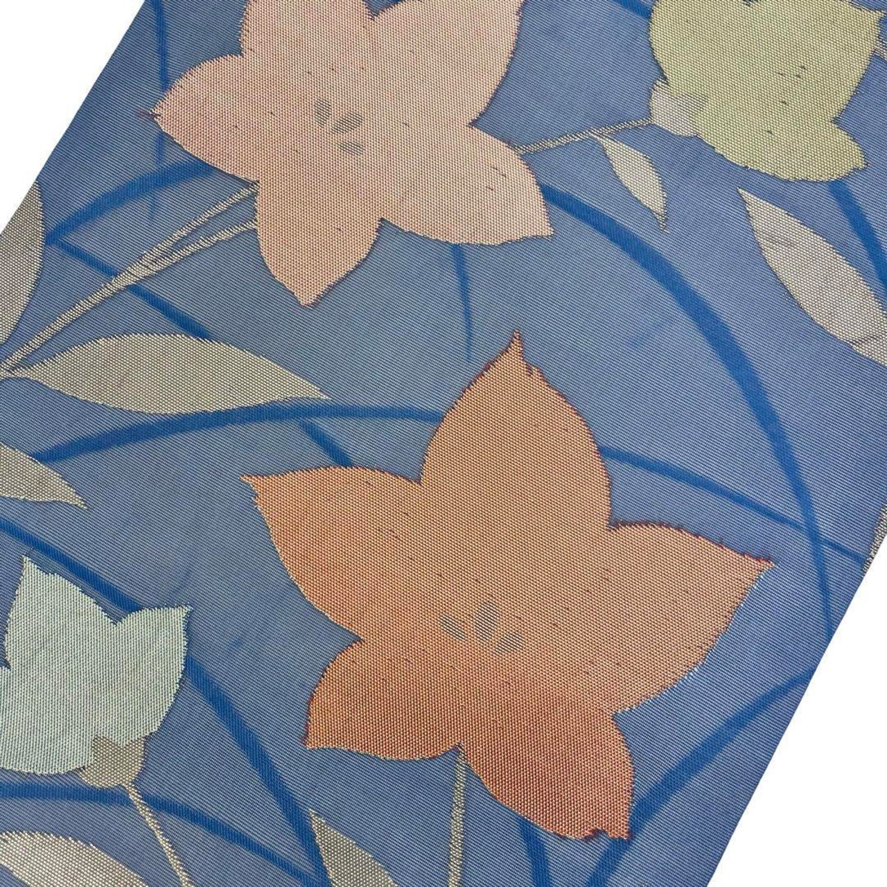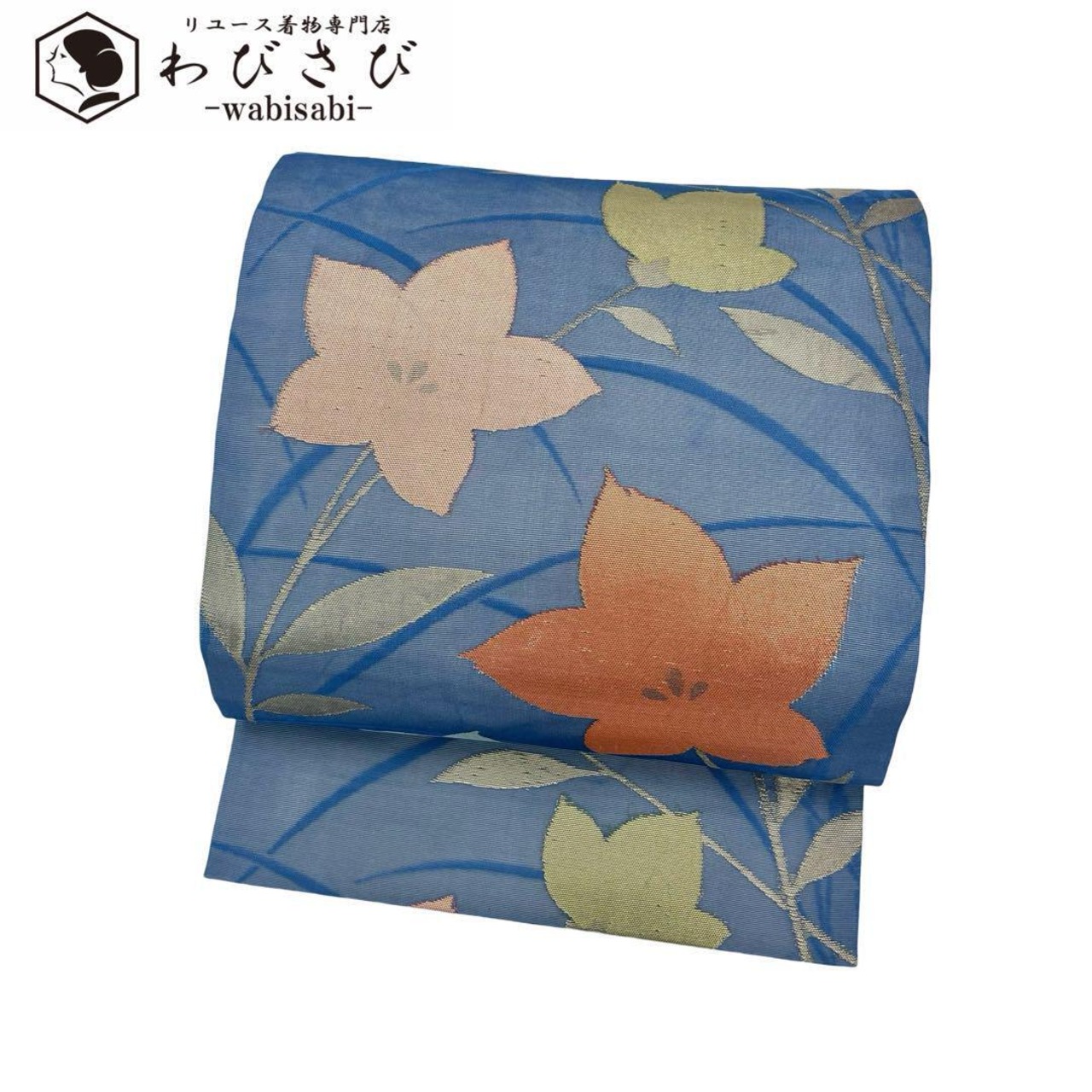 夏帯 名古屋帯 紗 桔梗の花模様 金糸 縹色 O-3957