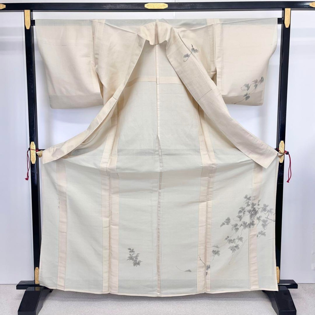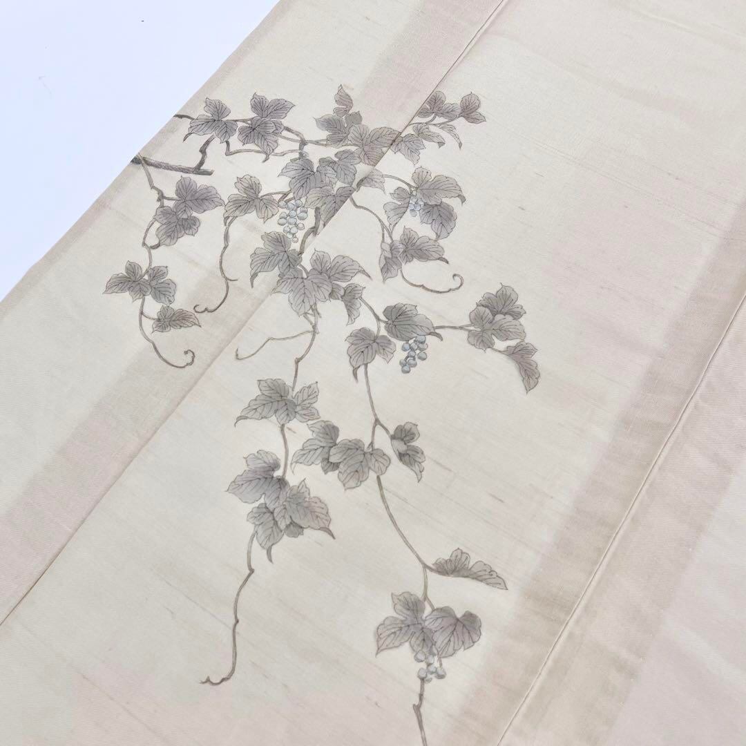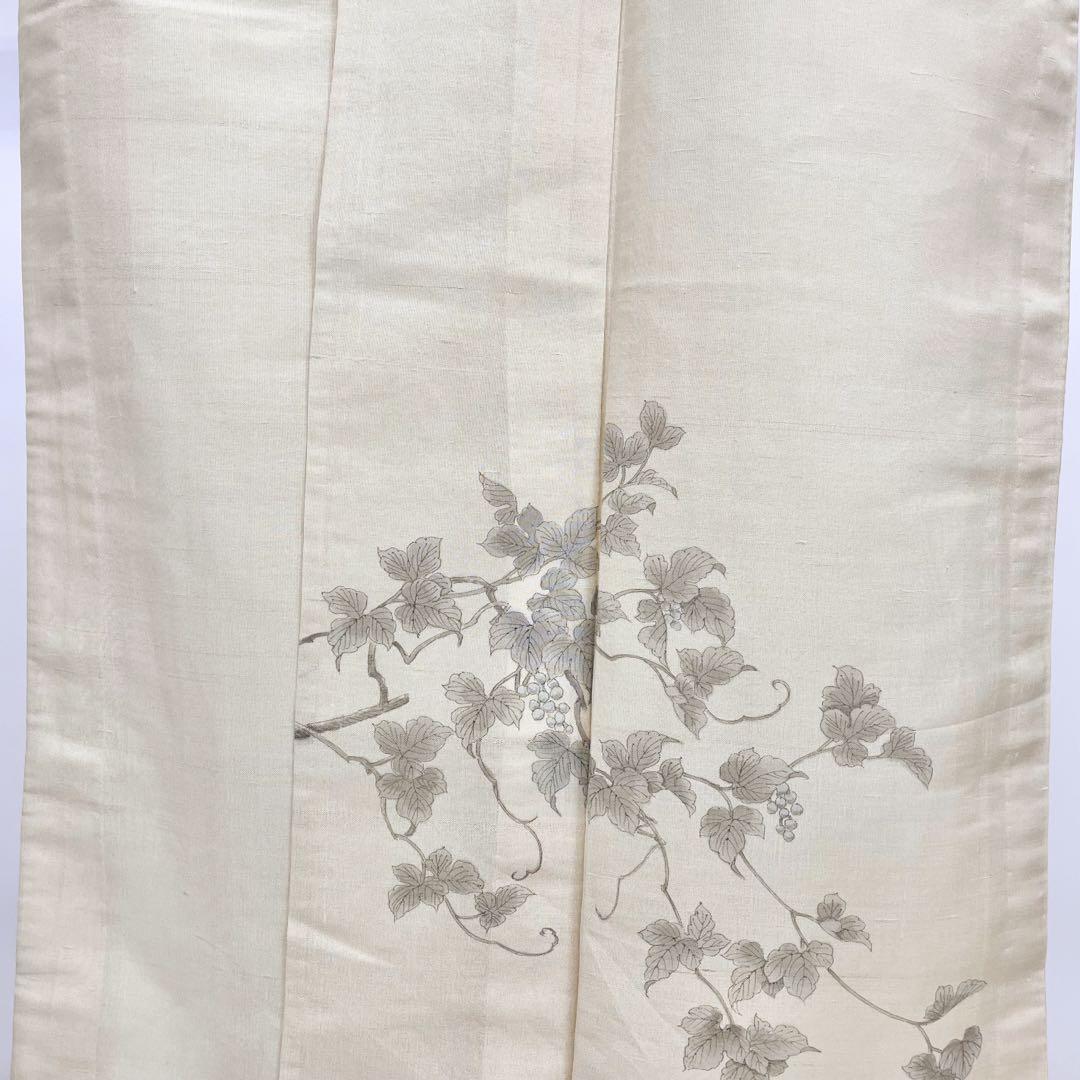 枯野色の涼しげな透け感のある紗紬に手描きの葡萄柄がデザインされた素敵な柄裄のお品でございます。