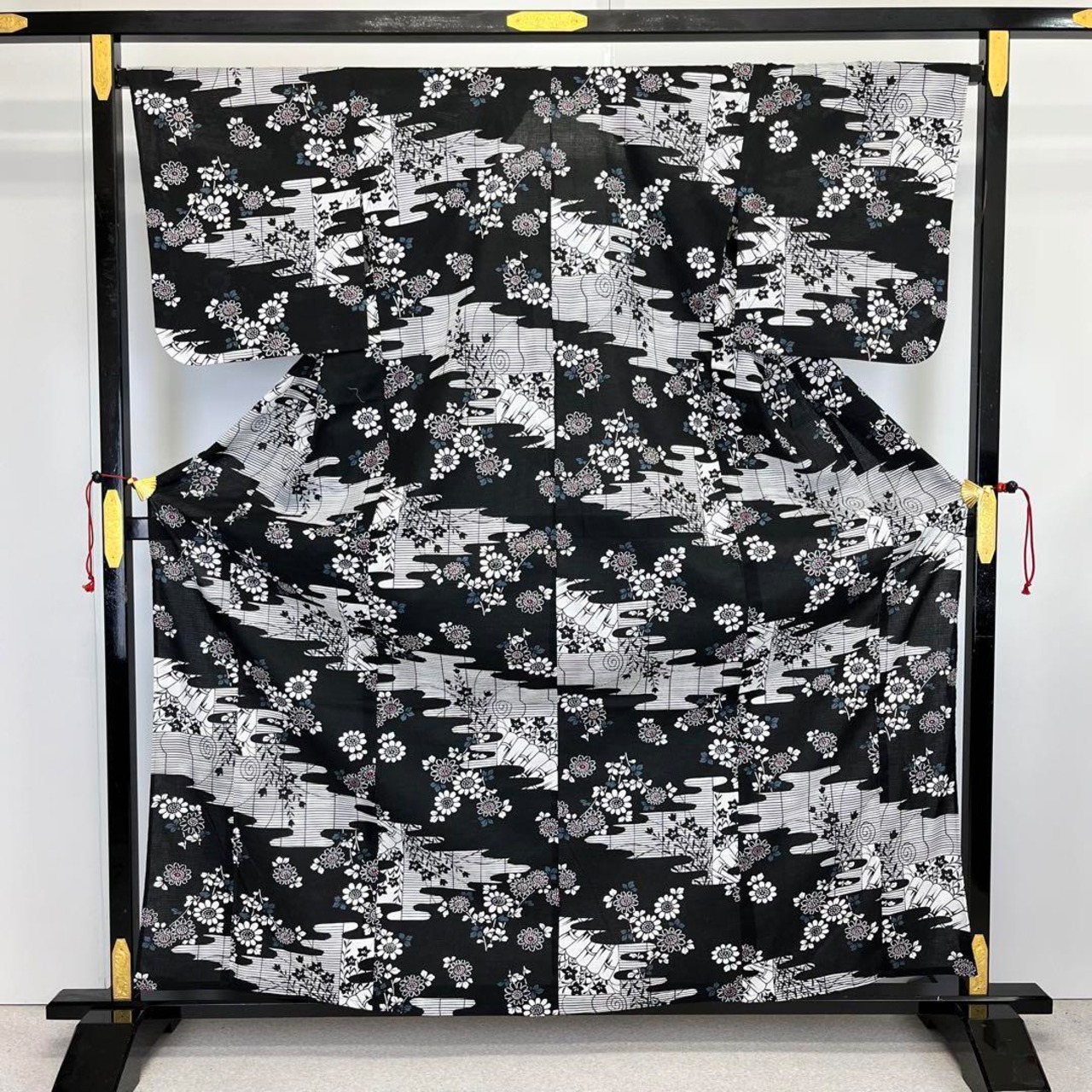 夏着物 浴衣 霞模様に花柄 綿紅梅 黒色 トールサイズ K-3890