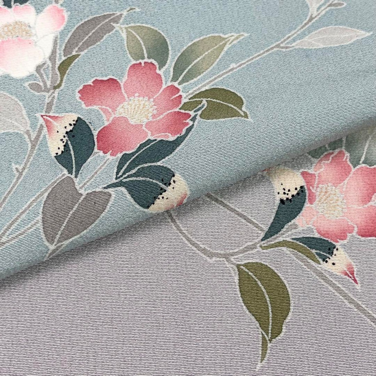 淡水色の優しいお色味の縮緬に暈し染、椿の花模様がデザインされた素敵な柄裄のお品でございます。
