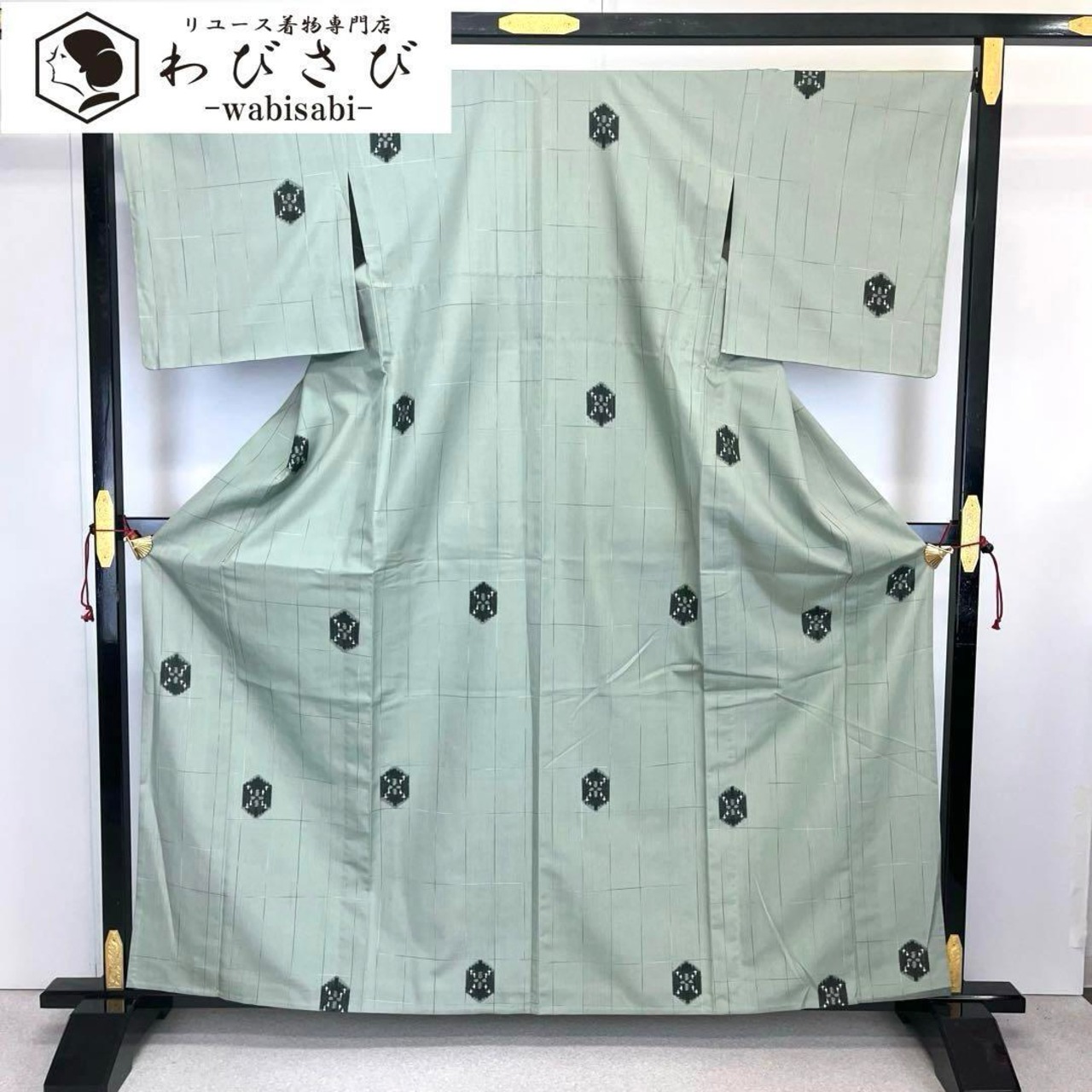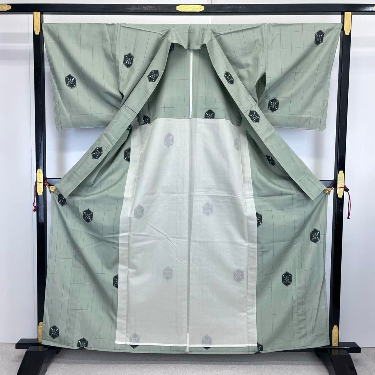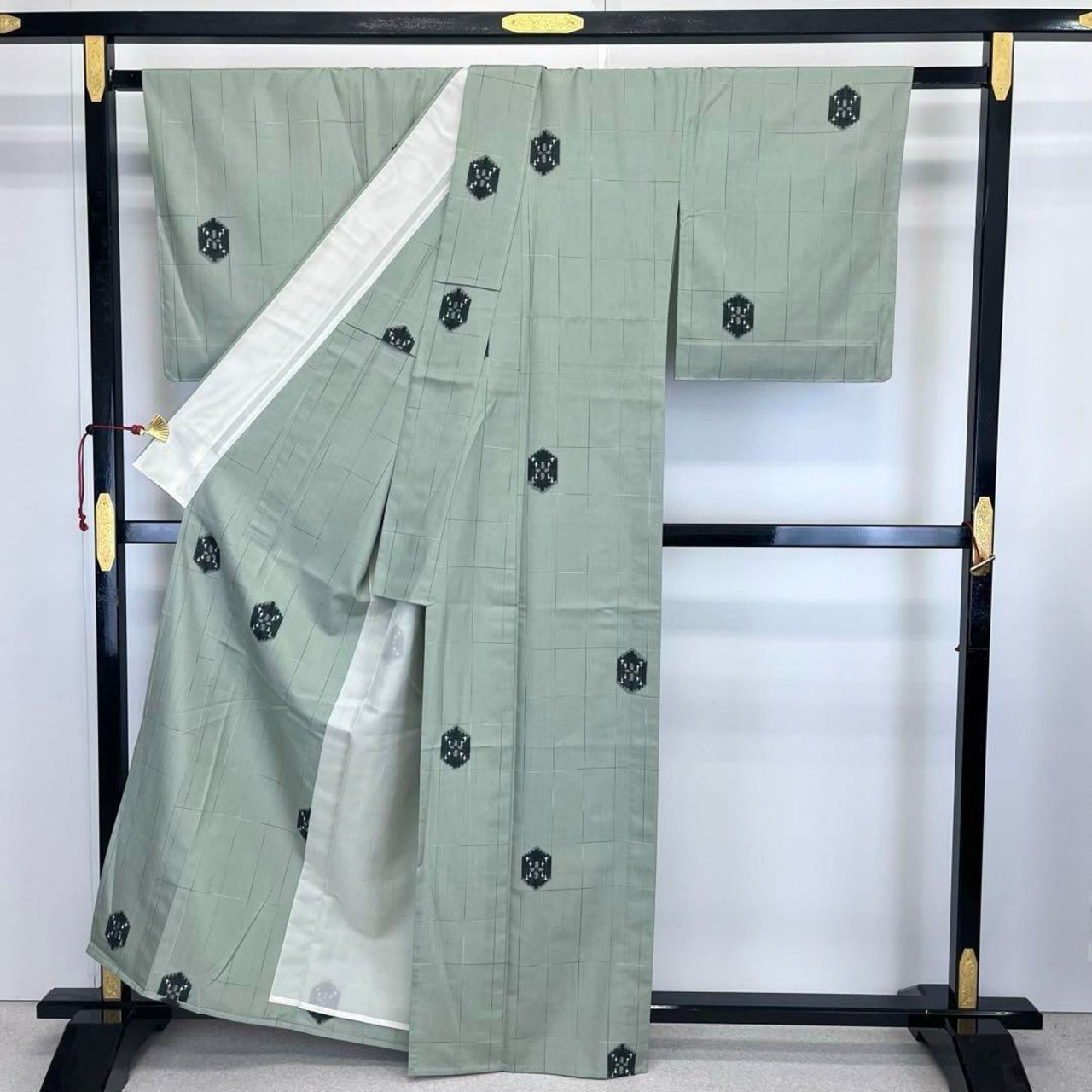 彩遊季と題された利休鼠色の落ち着きのあるお色味に飛び柄の六角織模様がデザインされた素敵な柄裄のお品でございます。