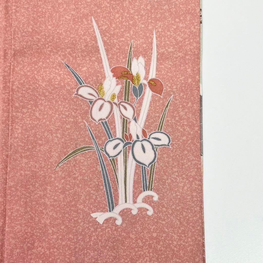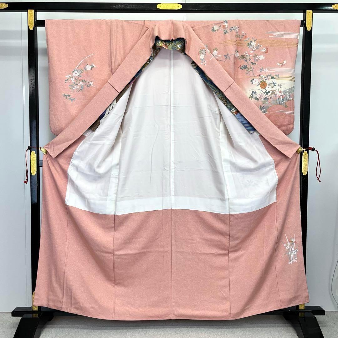 薄紅梅色の縮緬に暈し染、流水、四季の花模様などがデザインされた素敵な柄裄のお品でございます。