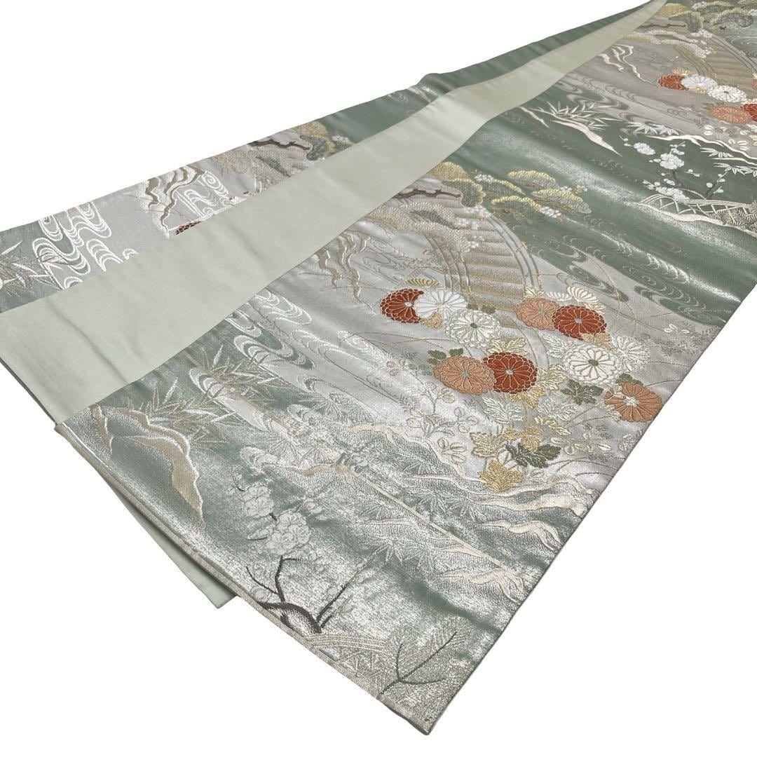 袋帯 蒔絵箔 流水に橋 松竹梅 菊の花 金銀糸 O-3965 着物 きもの kimono 和服 和装 中古 リサイクル着物 【送料無料】