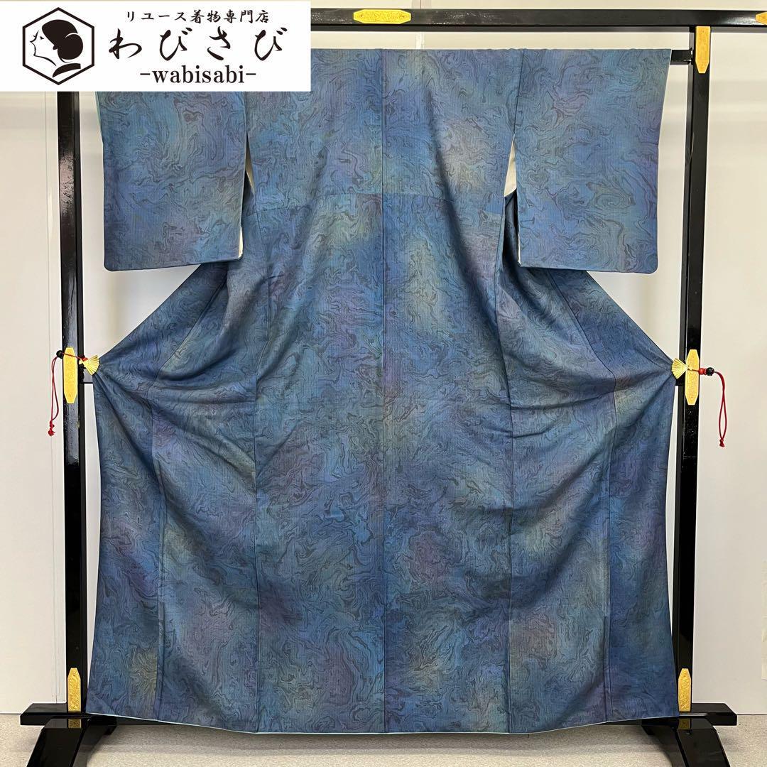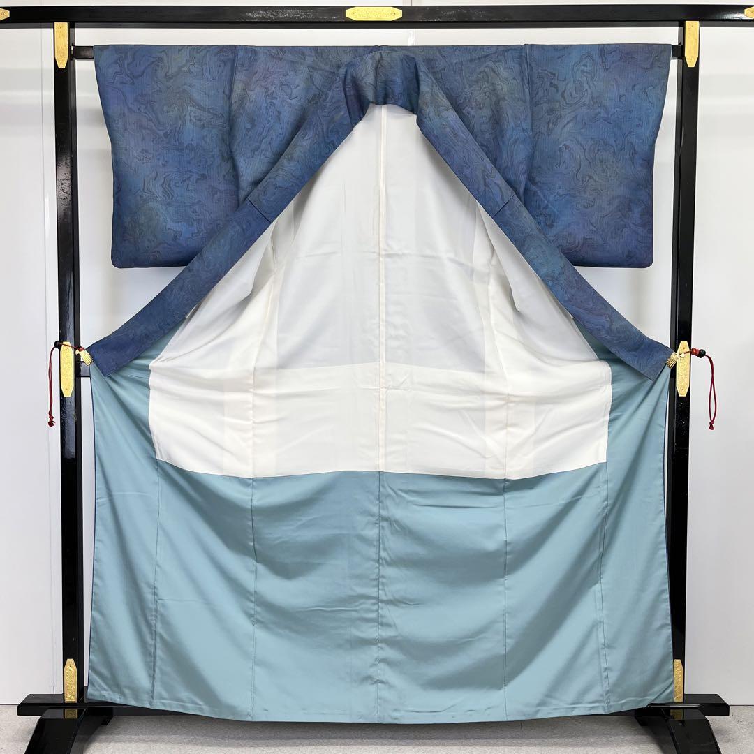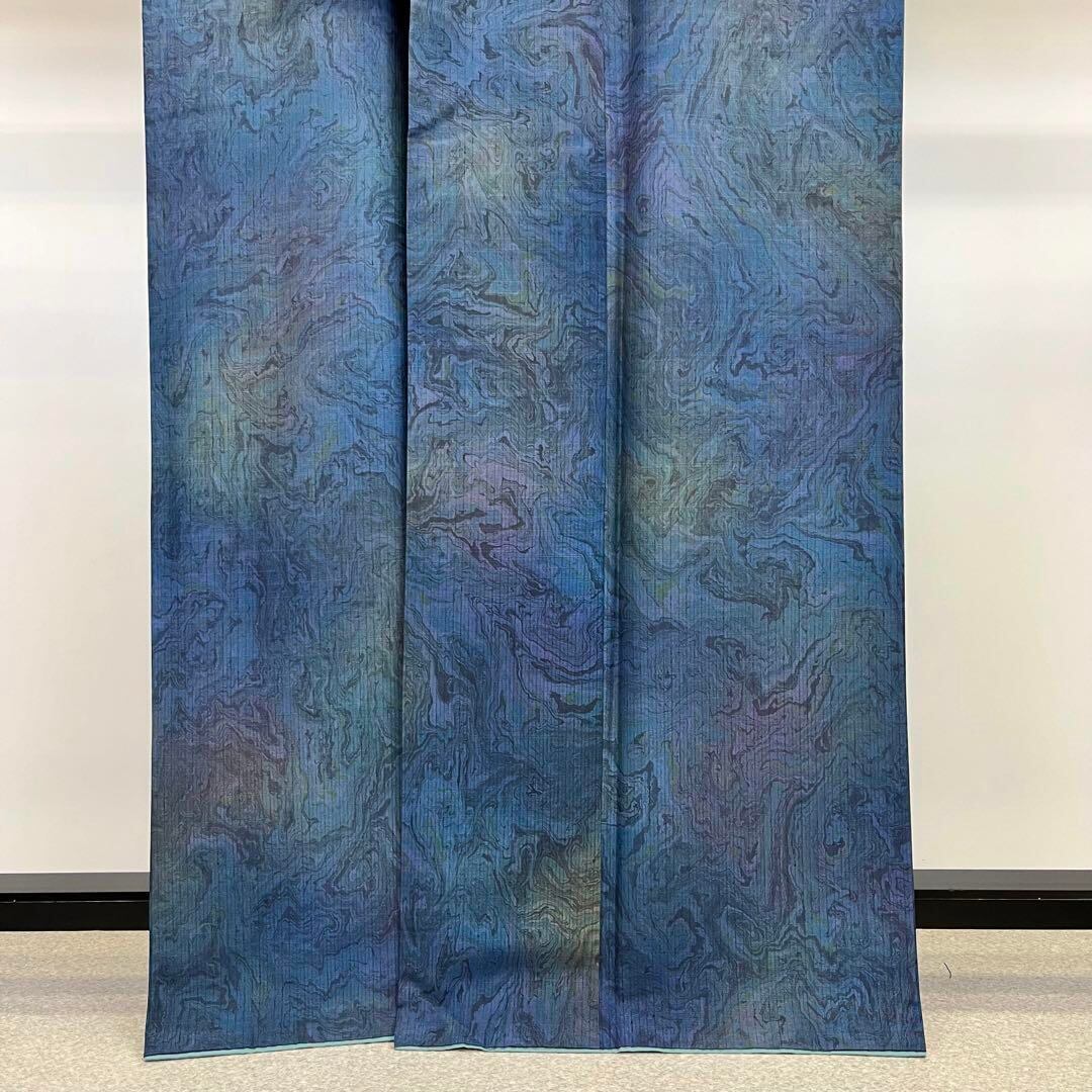 青色ベースのお色味に淡い暈しに本墨流しの美しい柄裄の素敵なお品でございます。