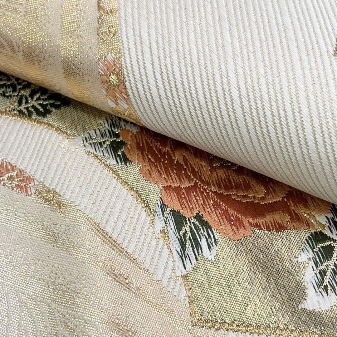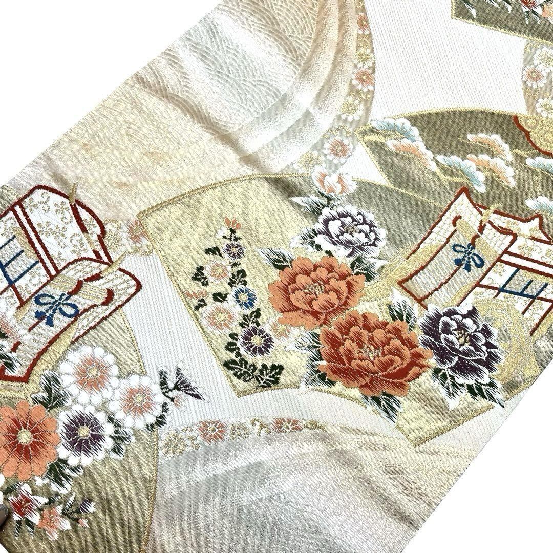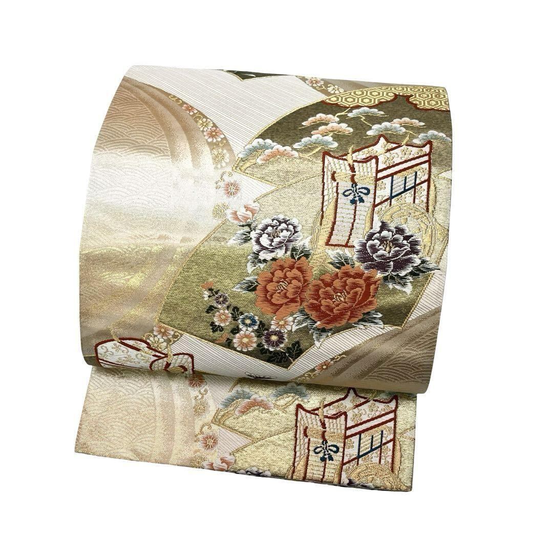 袋帯 御所車に花模様 牡丹 菊 地紙 金銀糸 O-3964 着物 きもの kimono 和服 和装 中古 リサイクル着物 【送料無料】