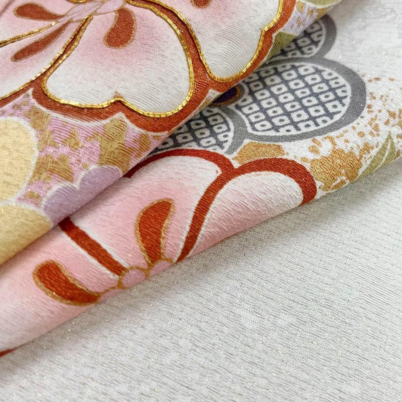 乳白色の品のあるお色味に金通し、暈し染、金駒刺繍などで華やかで美しい花柄模様がデザインされた上品な彩りの素敵な柄裄のお品でございます。