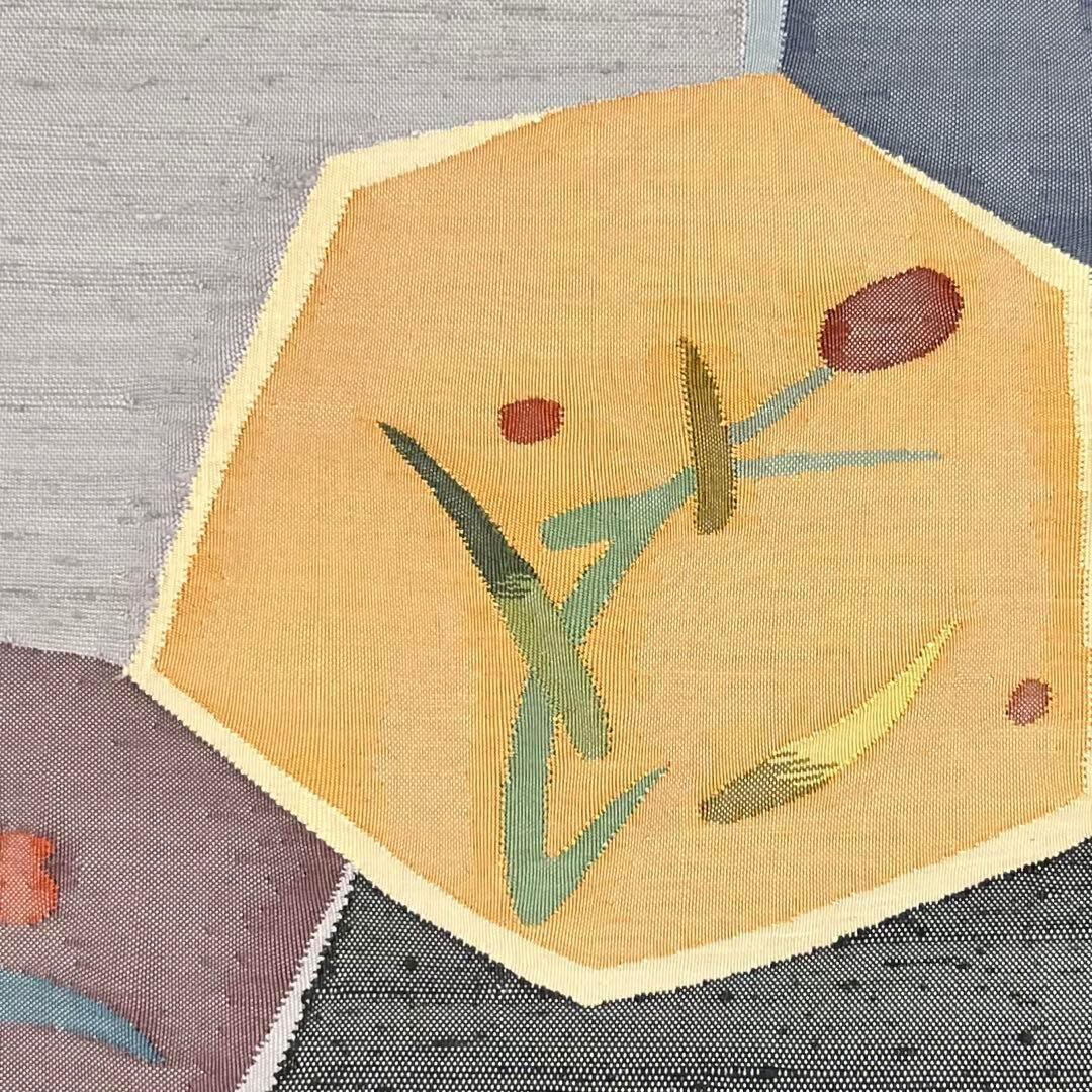 織部連山、納戸鼠色の落ち着きのあるお色味の紬に抽象柄がデザインされた味わいのある素敵な柄裄のお品でございます。