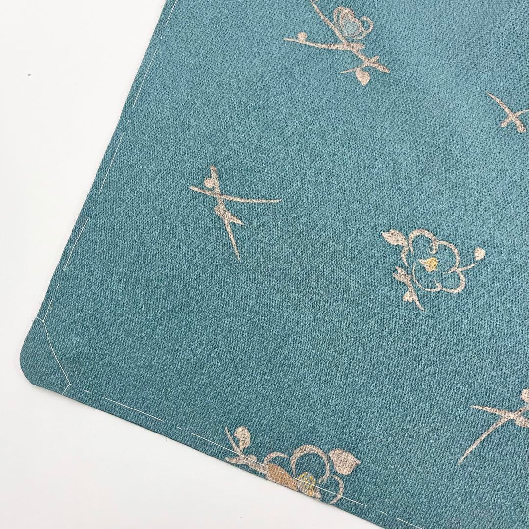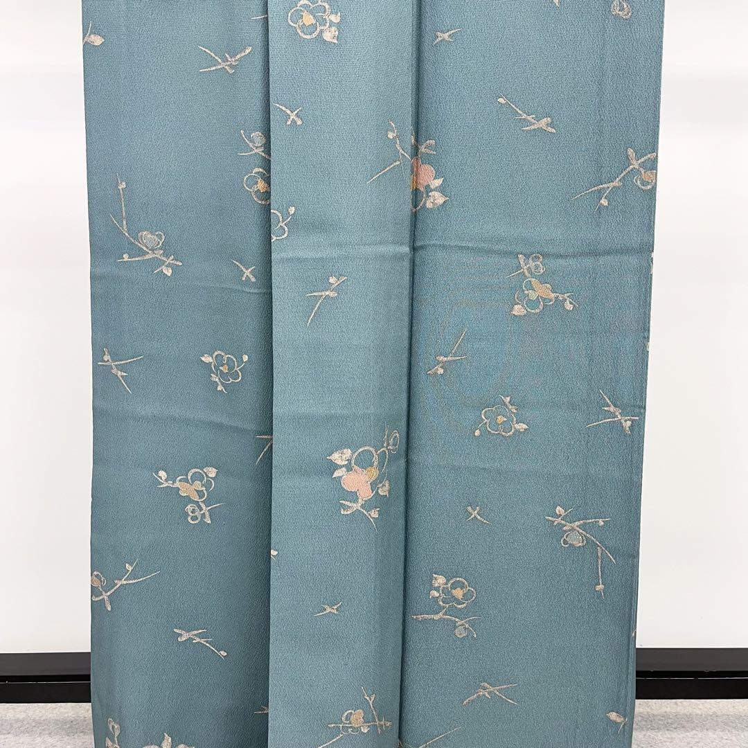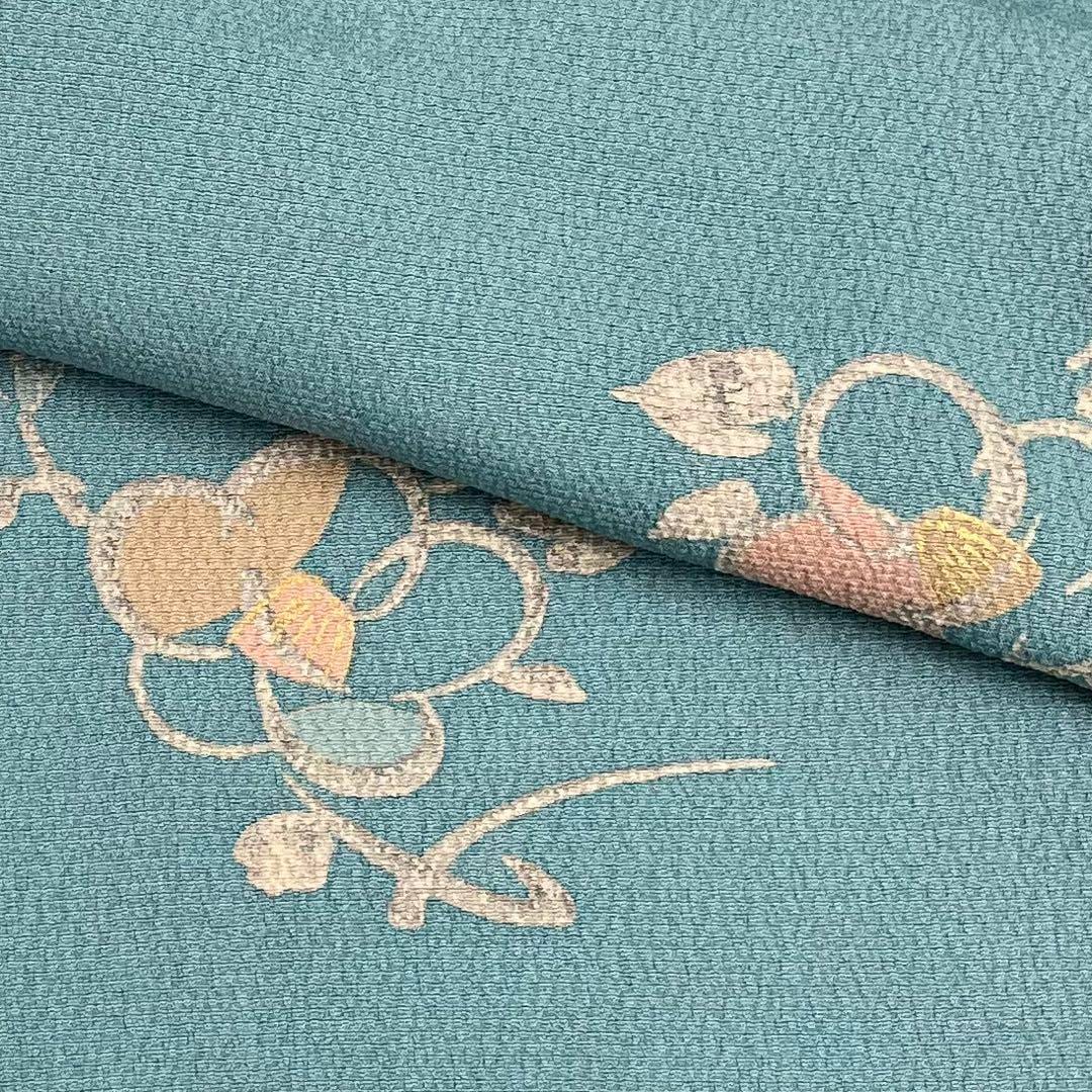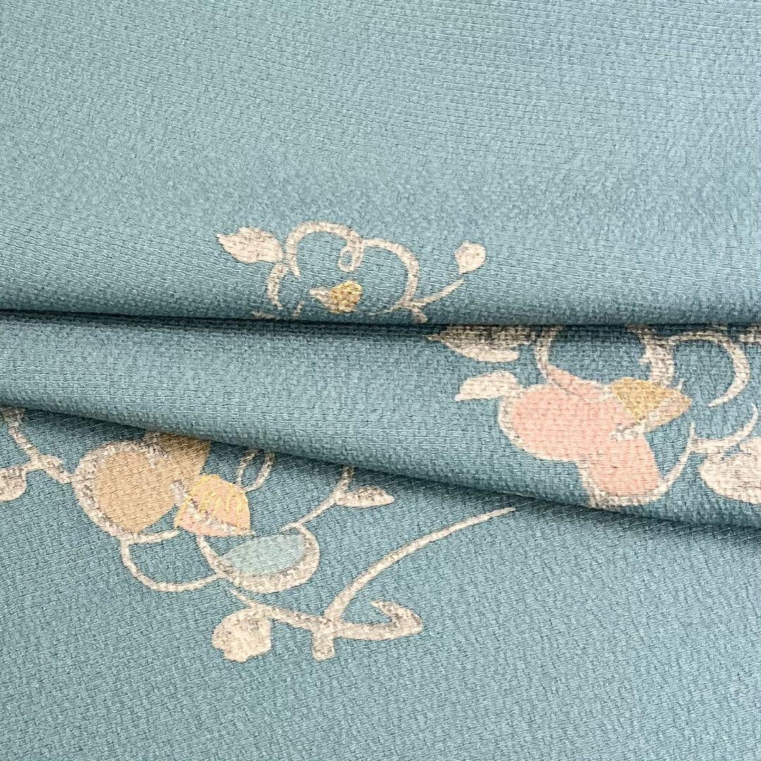 濃浅葱鼠色の品のあるお色味の縮緬に椿の花模様がデザインされた素敵な柄裄のお品でございます。