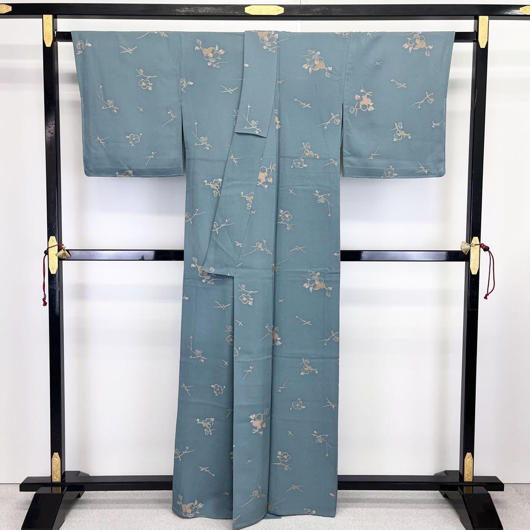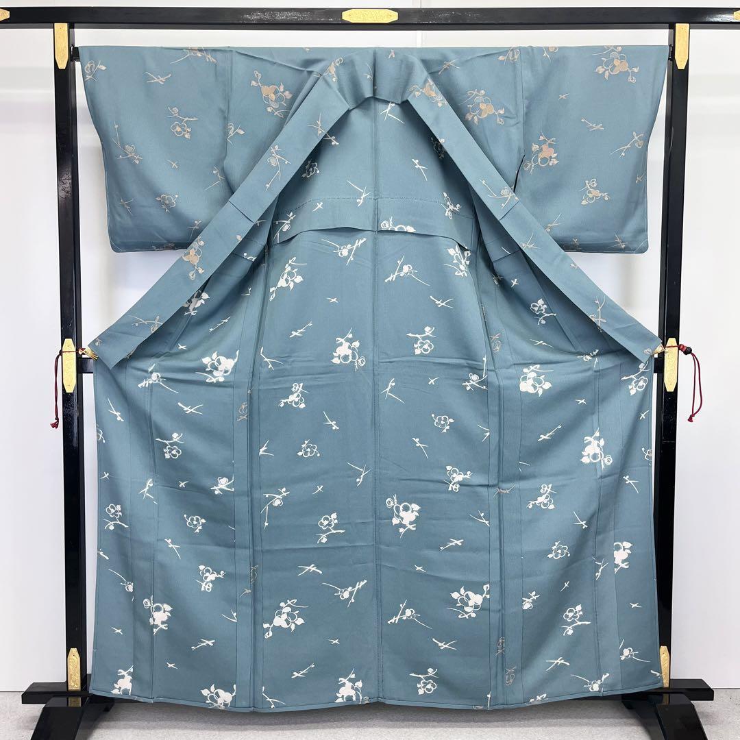 単衣 小紋 椿の花模様 縮緬 濃浅葱鼠色 トールサイズ しつけ糸 K-3939