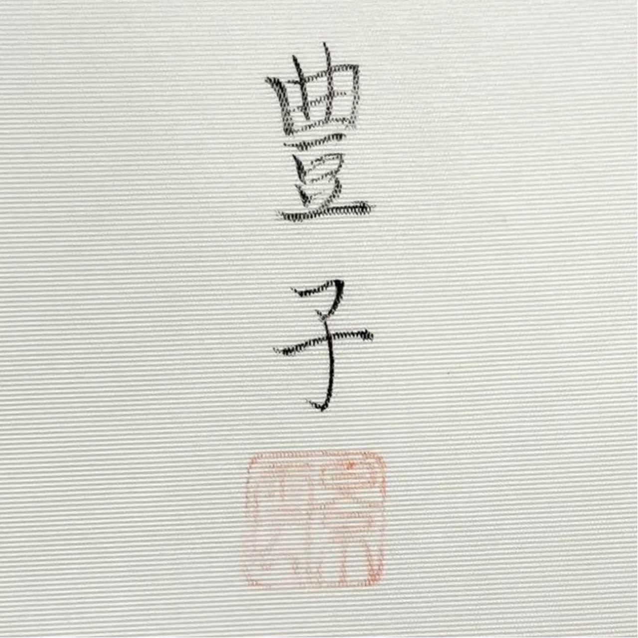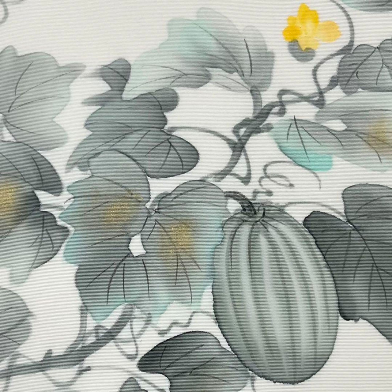 乳白色の塩瀬に手描き、墨描きのカラスウリがデザインされた素敵な柄裄のお品でございます。