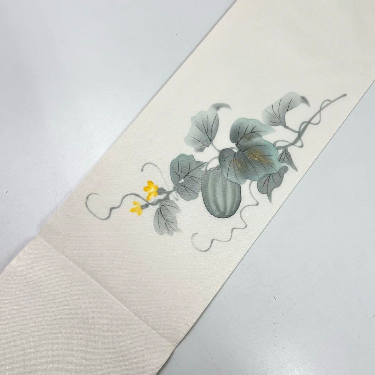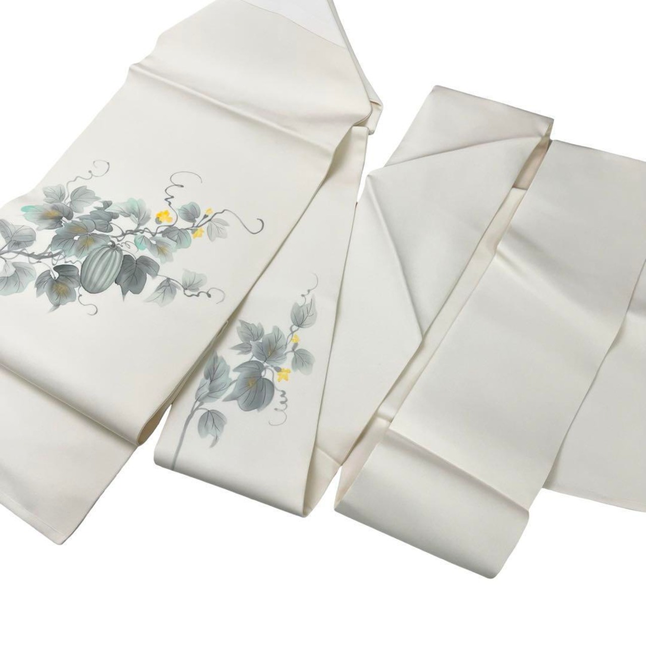 名古屋帯 作家物 塩瀬 手描き カラスウリ 乳白色 しつけ糸 長尺 O-3980
