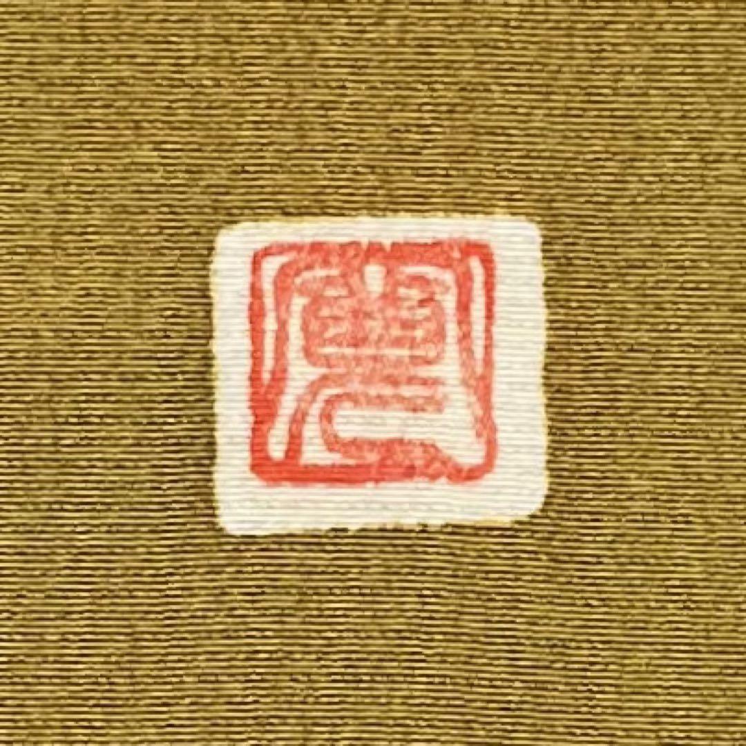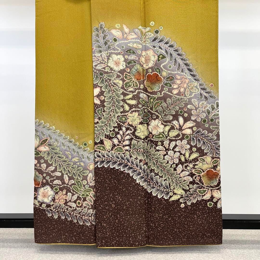 芥子色の落ち着きのあるお色味の縮緬に美しい辻が花絞りの柄行がデザインされた素敵なお品でございます。