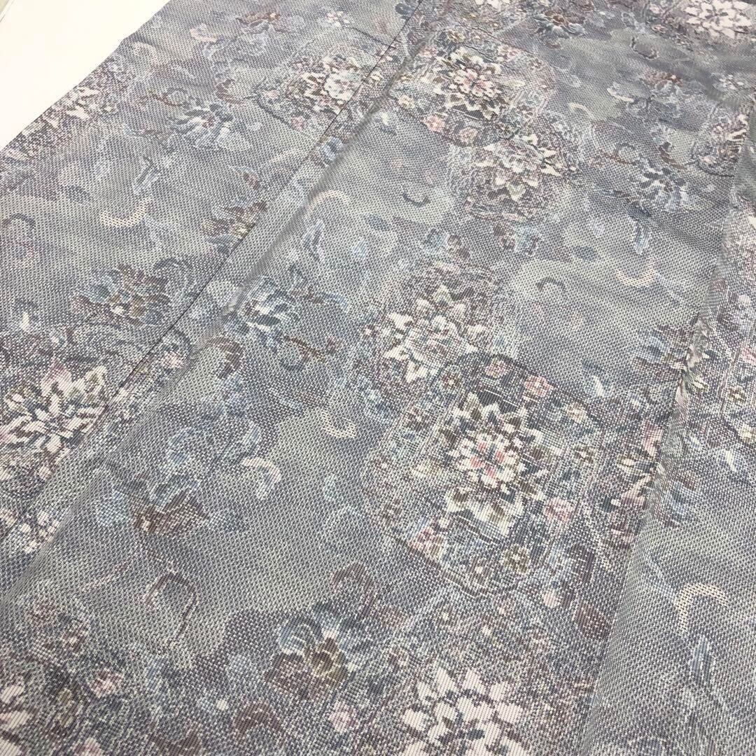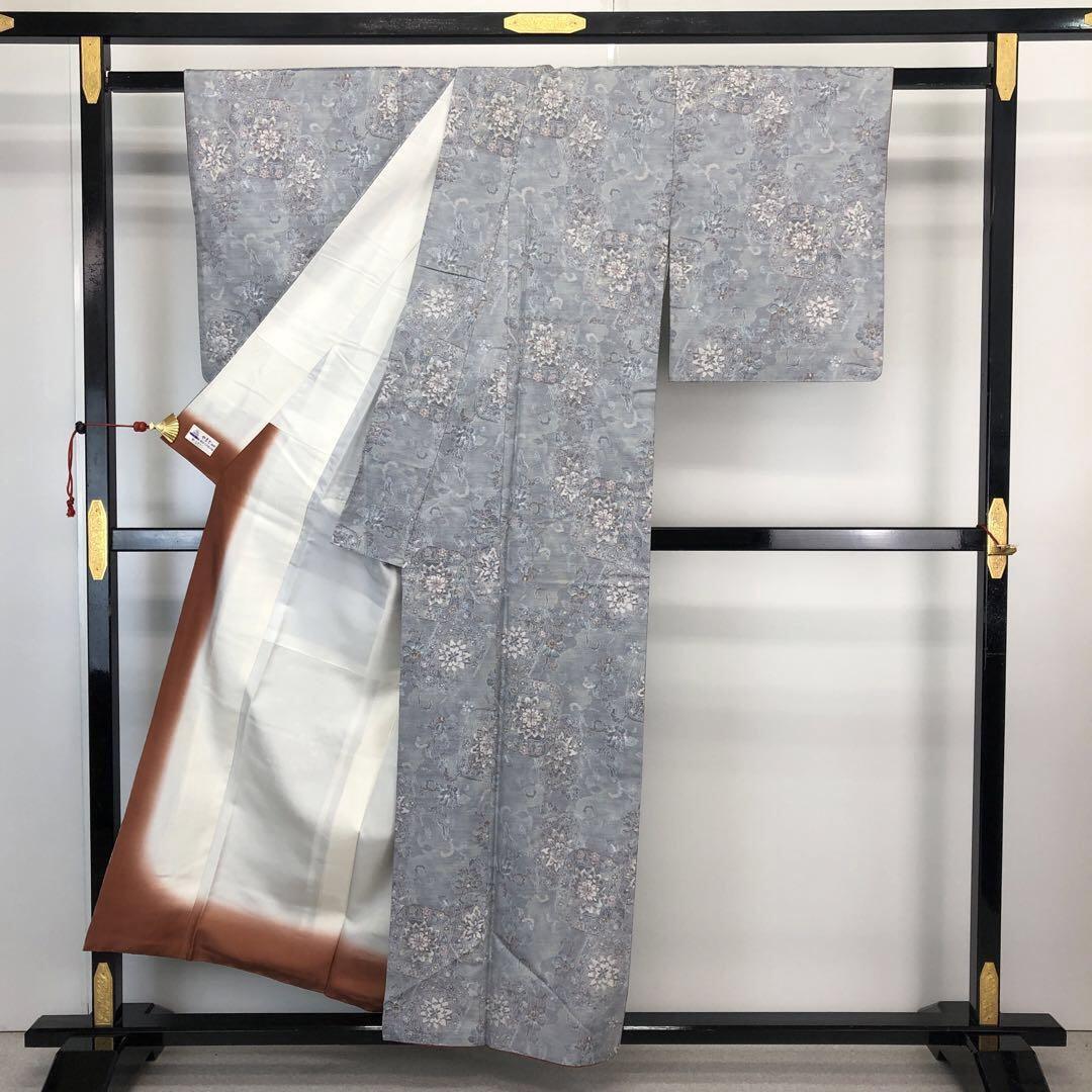 水銀色ベースのお色味に美しい花模様がデザインされた上品な色彩の白大島のお着物です。