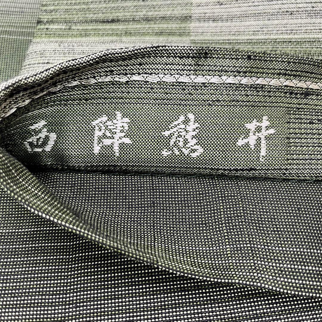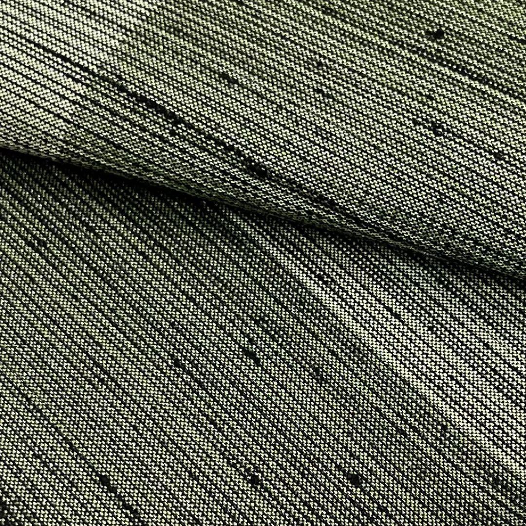 織部色の落ち着きのあるお色味の紬に銀通し、格子柄がデザインされた雰囲気の良い素敵な柄裄のお品でございます。