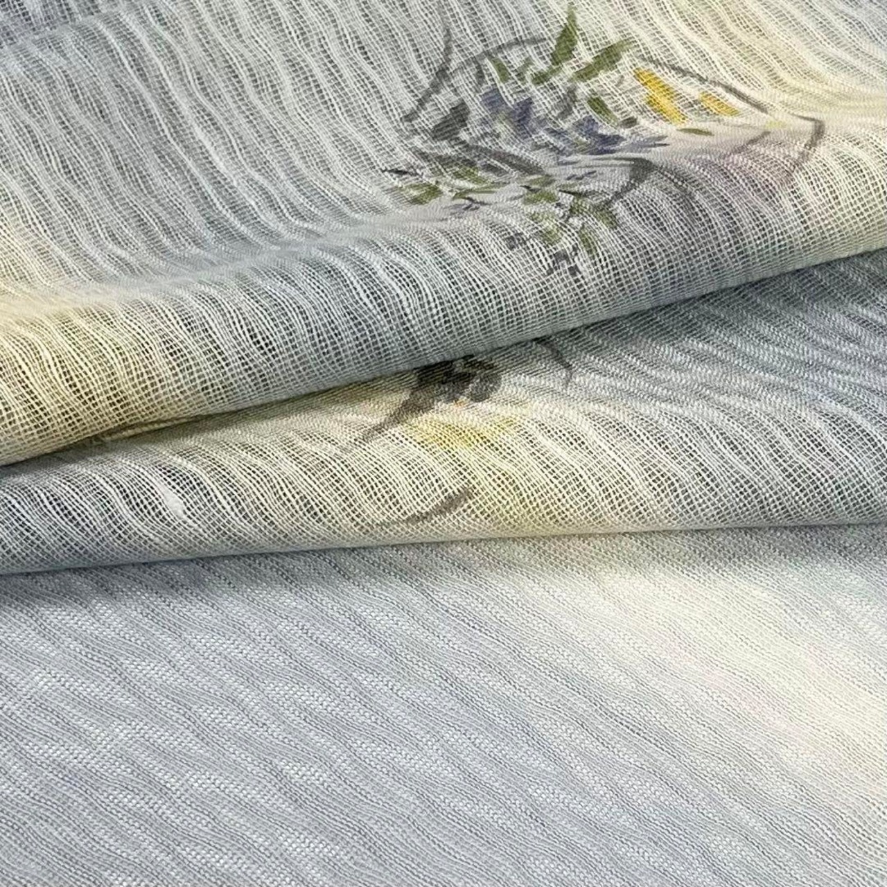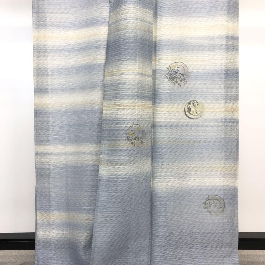 透け感のある夏すくいの軽くて涼しげな生地、横柄のグラデーションに手描きの丸に花柄、蛍の柄裄がデザインされた雰囲気の良い涼しげで大変希少なお品でございます。