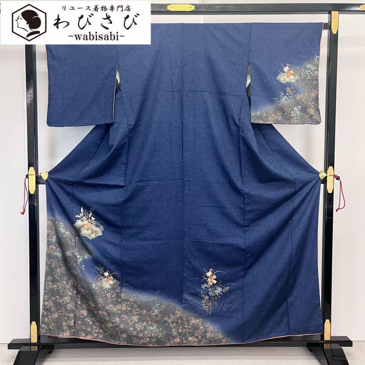 付下げ 地紙に花模様 菊 萩 刺繍 暈し 金彩 濃紺色 K-3957 着物 きもの kimono 和服 和装 中古 リサイクル着物 【送料無料】