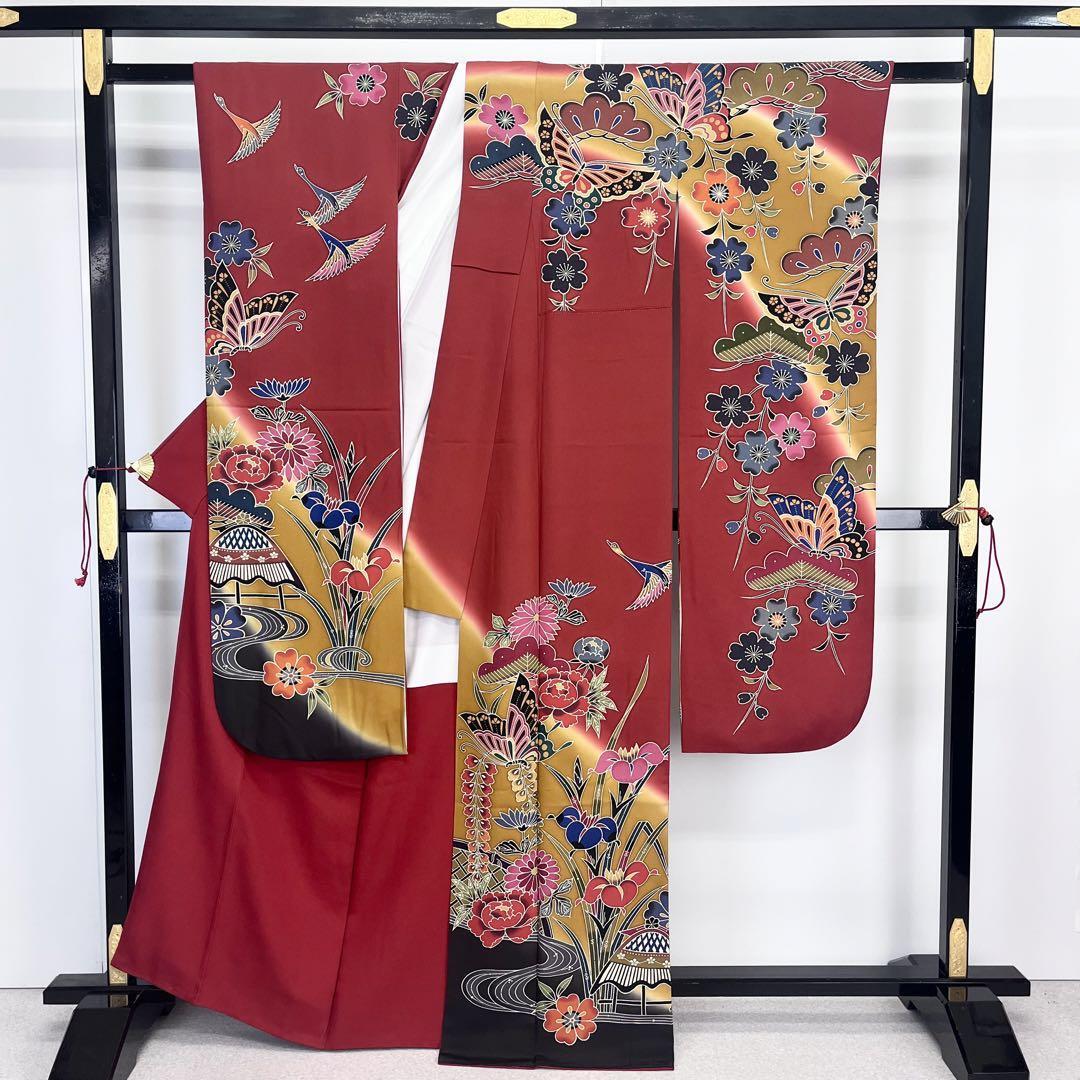 振袖 作家物 京紅型 京友禅 美しい花々に蝶々 飛翔鶴 蘇芳色 K-3955
