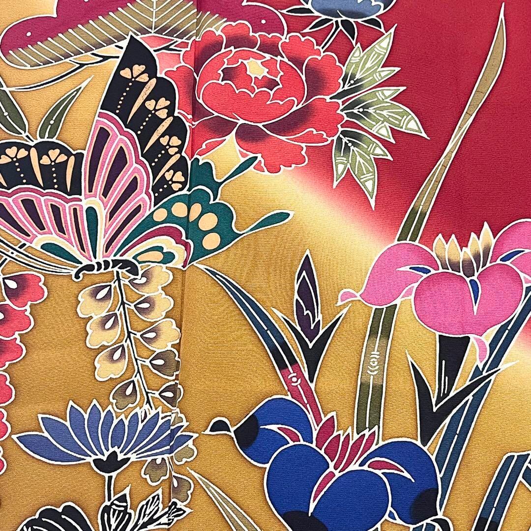 蘇芳色のお色味に暈し、色鮮やかな京友禅、美しい牡丹、菊、花菖蒲などの花々に蝶々、飛翔鶴がデザインされた京紅型の素敵な柄裄のお品でございます。