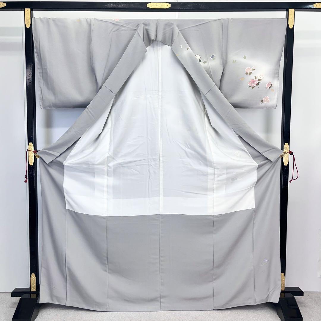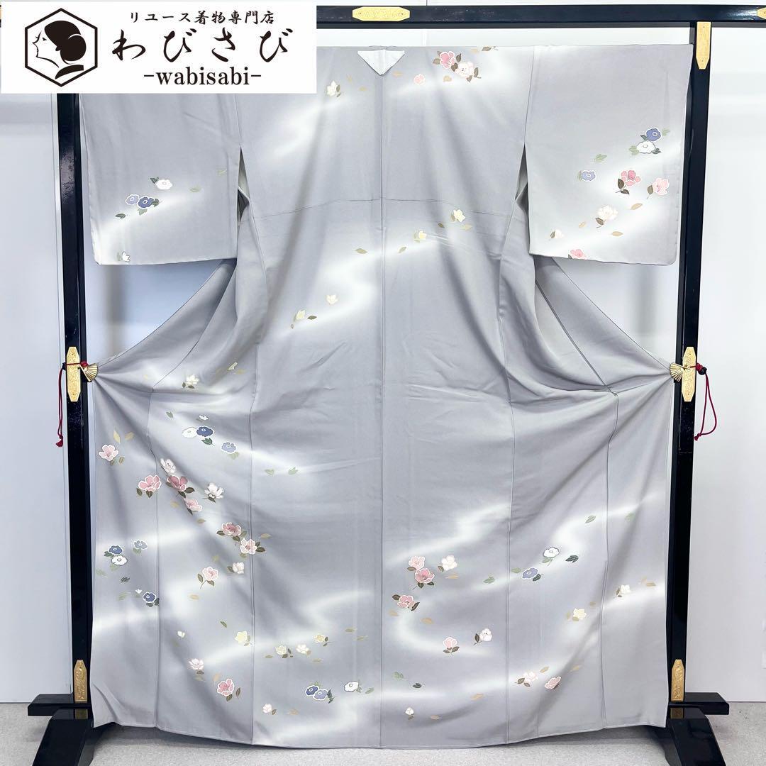 付下げ 暈しに花模様 椿 菊 金彩 縮緬 薄墨色 トールサイズ K-3954