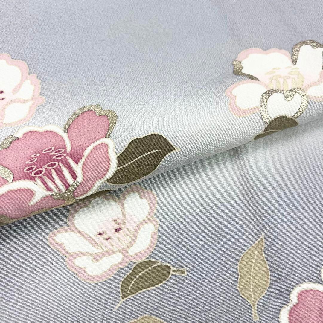 薄墨色の品のあるお色味の縮緬に暈し、椿や菊の花模様がデザインされた素敵な柄裄のお品でございます。