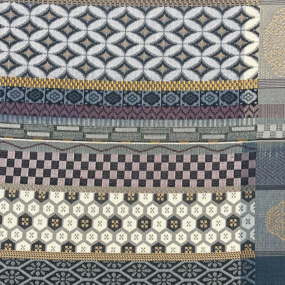七宝、市松、花亀甲などの横段織模様がデザインされた雰囲気の良い素敵な柄行のお品でございます。