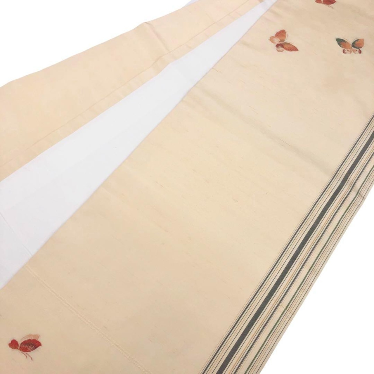 麹色の自然な雰囲気のお色味の紬、縦縞模様に蝶々の飛び柄がデザインされた素敵なお品でございます。
