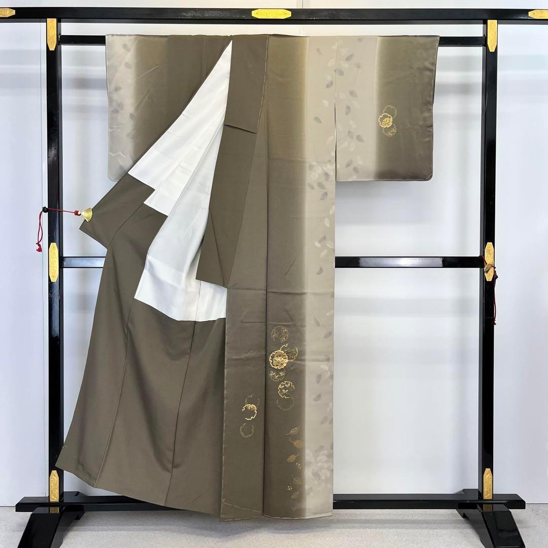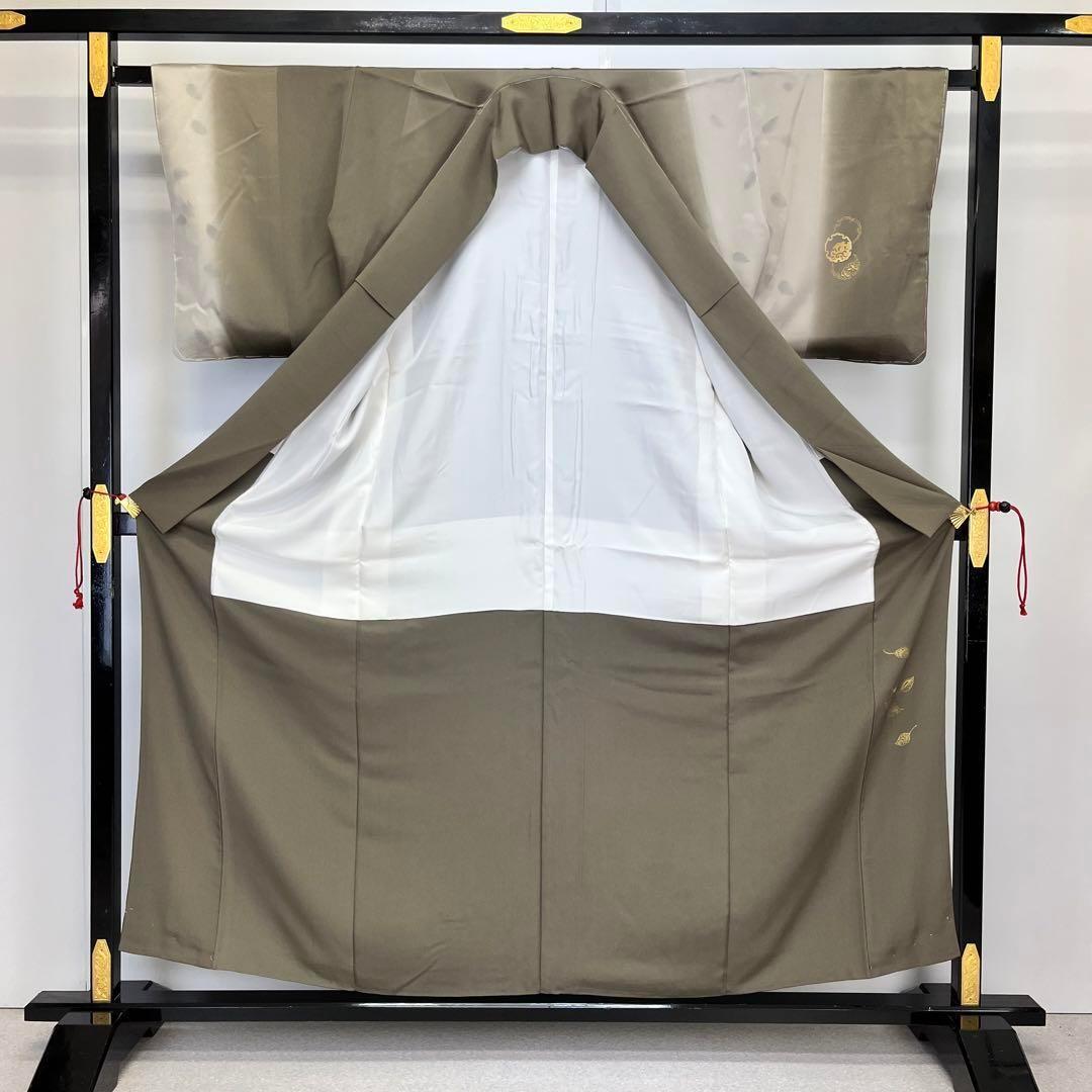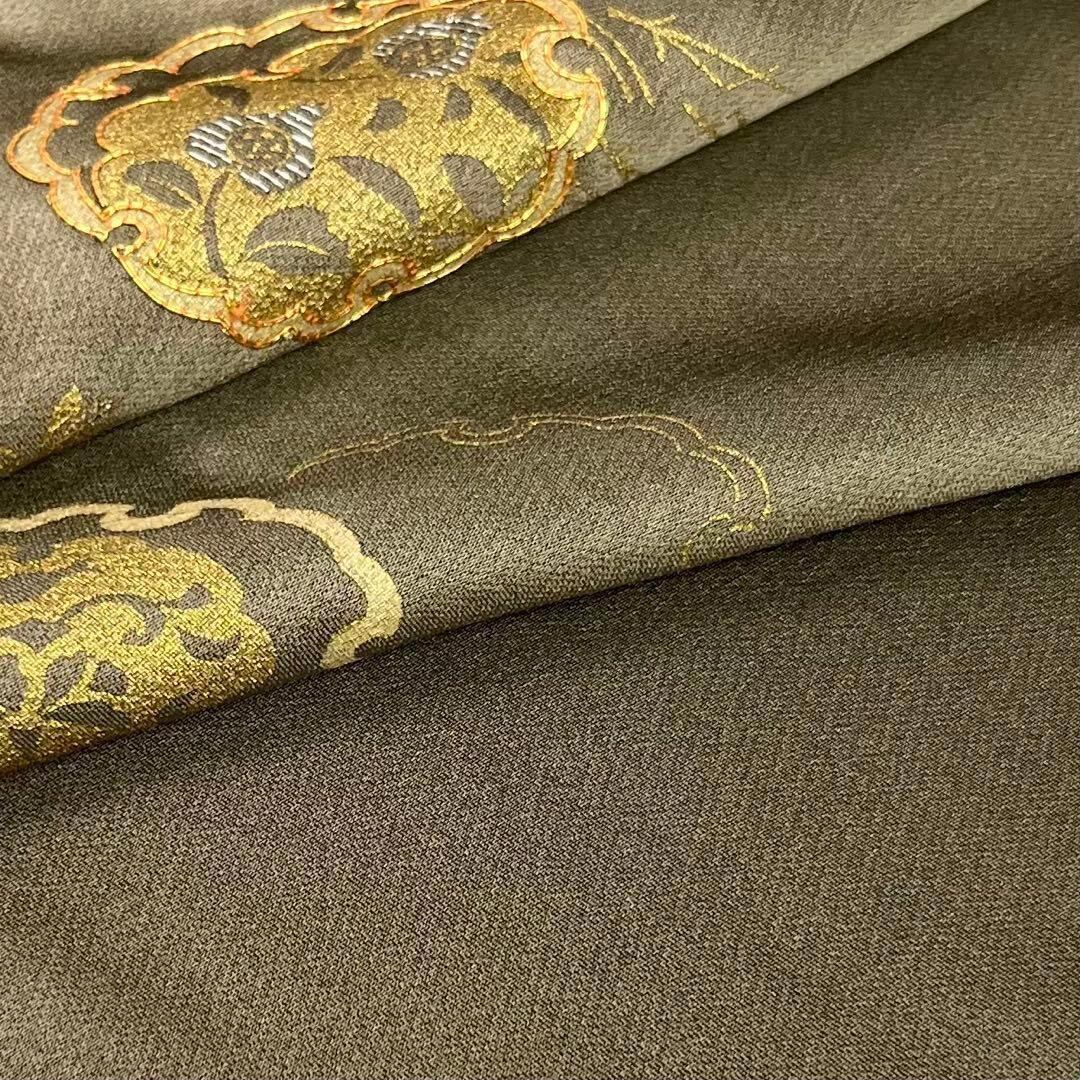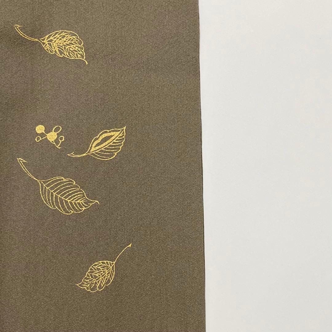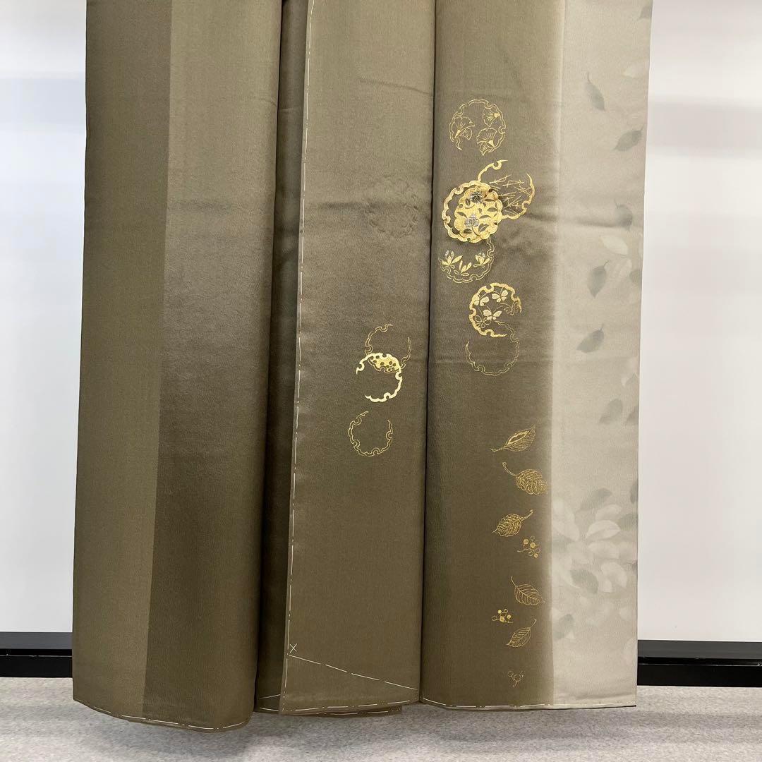 柳煤竹色ベースの染分け、金彩、金駒刺繍が使われた雪輪に葉模様がデザインされた落ち着きのあるお色味の素敵なお品でございます。