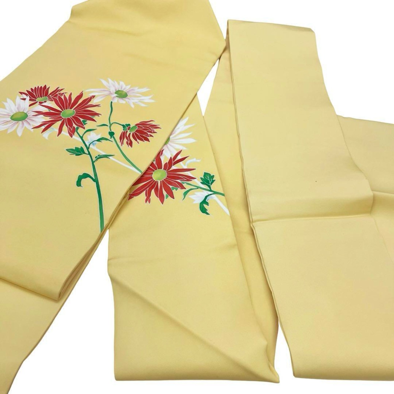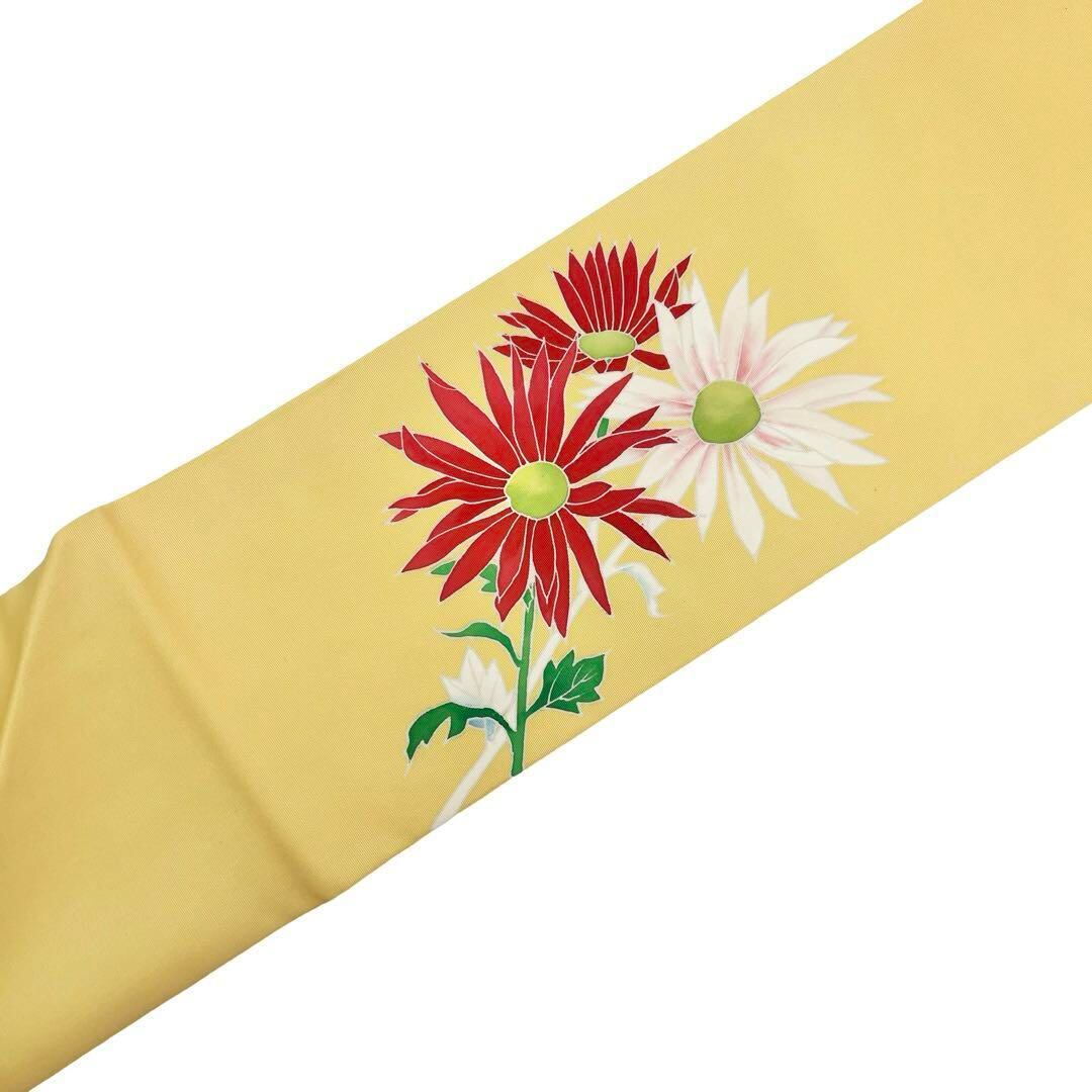 名古屋帯 塩瀬 手描き 赤白花模様 卵色 O-4035