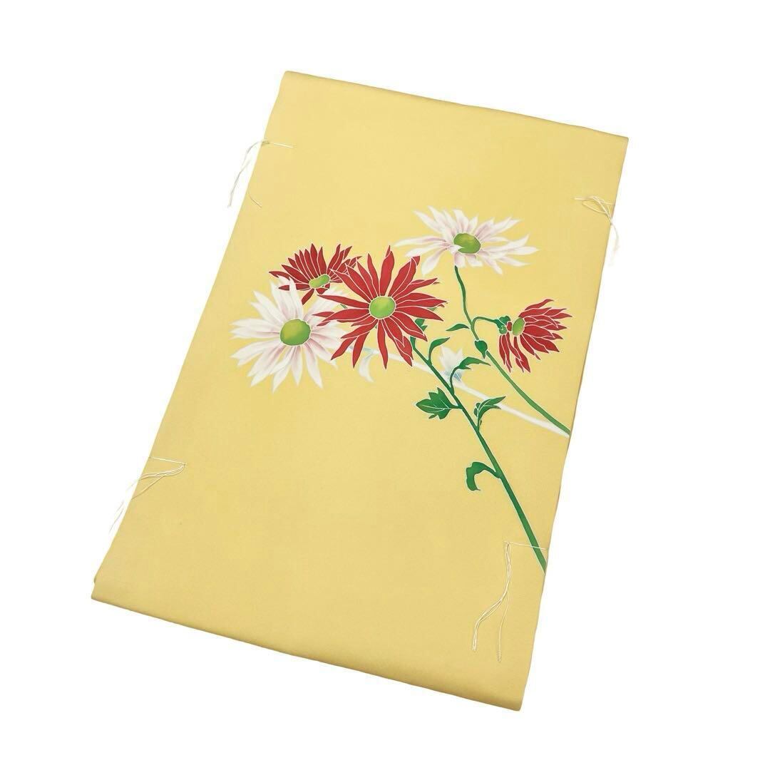 卵色のお色味の塩瀬に赤白の花模様が手描きでデザインされた素敵な柄裄のお品でございます。